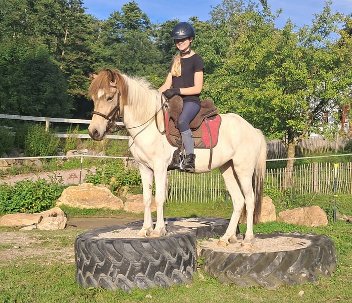 Cooler, cooler Fjalla! This pony mare will melt everyone’s heart! Beautiful coloring combined with a wonderful temperament and fabulous, rhythmic gaits, including a good Tölt even under saddle. A foal pony from Germany, absolutely robust and free of eczema, well-socialized. Extremely calm and laid-back, open to fun and adventures, raised in a family environment, lovingly trained. Farrier, trailer loading, going for walks alone — all no problem. Now ready to explore the big wide world with you. Pedigree documentation available. Come visit and fall in love! Currently standing at 14.1 hh, age 3.5 years. Suitable for trail riding, outdoor, leisure, and therapeutic riding. Both English and Western riding are possible. Accustomed to herd life and open stable management; stall confinement is no issue. Equine passport available. All our horses are familiar with groundwork, different terrains, cars, agricultural machinery, as well as cows, donkeys, sheep, pigs, dogs, cats, and chickens. For more information and to arrange a viewing, please call 08536-2890292 (voicemail available) or 0157-78378455 (no mobile network at the farm). Please no private messages, emails, or WhatsApp inquiries! Sunday is our day of rest. Accessories and transport can be arranged at favorable rates. Every buyer is granted a contractual six-week exchange period. Prices are fixed. No installment payment inquiries, please. Anyone arriving with a trailer and taking the pony home will receive a €100 discount. Upon purchase, a €1,000 deposit in cash is due. If you wish to take the pony immediately, full payment is required. We offer a trial ride with two horses of your choice so you can get to know your dream horse and see if it’s the right fit for you. Each appointment costs €35, whether riding, lunging, preparing, or just walking around. Any additional rider (friend, partner, sister, trainer…) pays the same if riding along, just to observe costs €20. This amount will be refunded on the same day if you purchase the horse. Due to multiple incidents, we kindly ask for honest information regarding rider weight. We reserve the right to refuse a trial ride if the weight is not truthful. For the well-being of our horses, we prefer not to exceed 120 kg. As this is a living animal, these are only impressions from the caretaker and do not constitute guaranteed characteristics of the horse. Additional horses/ponies are available in my other listings or upon request.