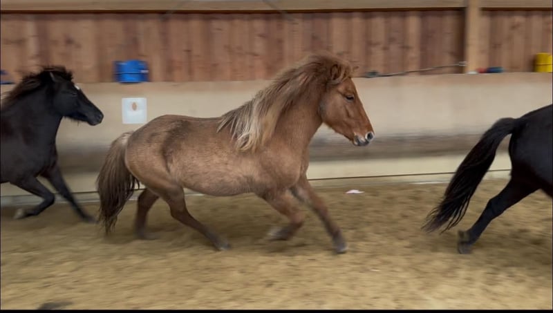 Vif von Möllenbronn is a friendly, five gaited, 3 year old young Fuschfalst mare. She has a very good pedigree. Her sire is LK1 in tölt, five gaits and pass and is himself elite tested. He is a son of Hrannar frá Flugumyri. Vif's dam ran successfully LK2 in sport (V1 and T1) with individual scores up to 7.0 for tölt, walk and trot. Vif is cooperative and friendly to handle. She is very uncomplicated in the herd. She shows all gaits with good ground coverage. Vif is growing up in a herd of young mares. She is regularly vaccinated and wormed. Foal test: Exterior: 7.8 Interior: 7.9 Gaits: 7.9 Overall: 7.87 Judges' verdict: Self-confident, well-built foal with lots of natural tölt and good gait distribution, energetic hindquarters, lots of speed and clear race passages