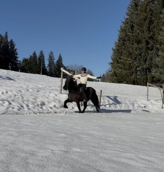 Luxusfreizeitpartnerin mit unerschrockenem, sehr lieben Charakter, viel Naturtölt und schickem Gebäude. Mega lieb zu Kindern und auch sehr gut für jüngere Reiter geeignet. 📍Standort: Lindau am Bodensee 🇩🇪 (nahe Schweiz 🇨🇭 & Österreich 🇦🇹) - Bildhübsche Stute (*2021) - Rappfarbwechsler - Mega braver & unerschrockener Charakter - Schicke Gänge, sehr gute Gangtrennung, viel (immer taktklarer) Naturtölt, alle Gänge mega bequem - Grundausbildung abgeschlossen, sehr leicht und fein zu reiten, nur mit Stimmkommando bis zum Halt bremsbar (Kennt Schenkelweichen, Vorhandwendung, Traver etc.. geht auch alleine problemlos und brav ins Gelände) - Stabiles, sehr gutes Gebäude, Stockmaß 1,37 cm (vom alten Typ) Trotz des jungen Alters ist sie aufgrund ihres lieben, äußerst coolen Charakters und ihren sehr einfach zu reitenden, bequemen Gängen bereits sehr gut für jüngere Reiter geeignet. Ausgebildet von IPZV Trainer (+ goldenes Reitabzeichen, API Lehrgangsleiter und weitere Qualifikationen). Aufgewachsen in einer kleinen gemischten Offenstallgruppe mit 24/7 Weidezugang (das ganze Jahr über). Regelmässig entwurmt, geimpft und war immer kerngesund, allerdings zeigt sie eine (minimale!) Mückenempfindlichkeit. Sie wird deshalb (an mückenreichen Tagen) einmal am Tag mit Fliegenspray eingesprüht. Daher wird sie deutlich unter Wert abgegeben (unter 10.000.-). Auf dem Reitfoto ist sie ohne Zügelkontakt im Tölt zu sehen (Reiterin ist 1,78m). Aktuelle Videos vorhanden.