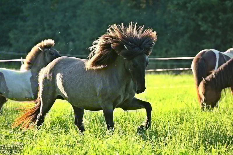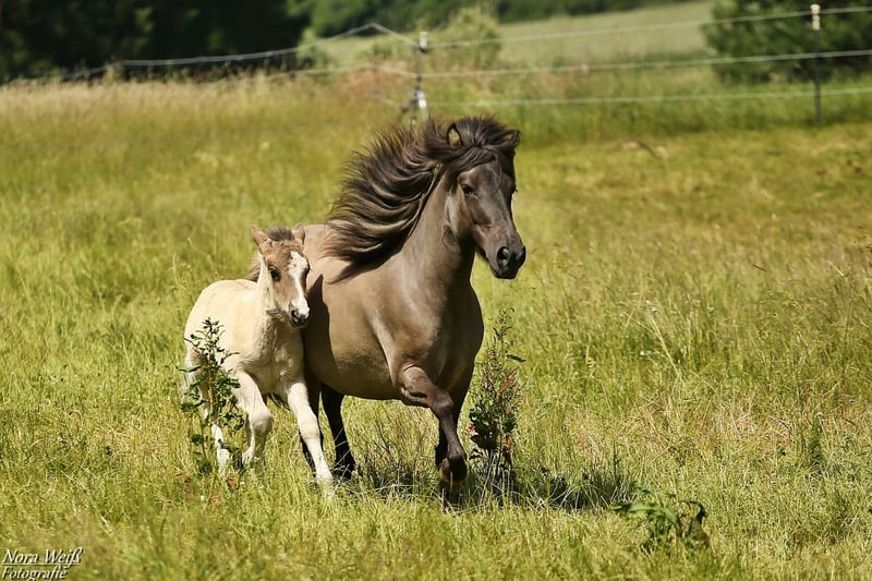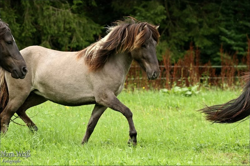 Blævör vom Grafenbuch *21.04.2019 V: Byr frá Strandarhjaleigu VV: Sjóður frá Kirkjubæ (Fizo 8,7! Gesamt, 9,0! für Reiteigenschaften, Ehrenpreis für Nachkommen) MV: Bylgja frá Strandarhjáleigu (Fizo 8,58! Gesamt, 8,7! Reiteigenschaften) M: Brynja frá Ey1 MVV: Keilir frá Midsitju (Fizo 8,63 Gesamt, Ehrenpreis für Nachkommen) Graufalbe Schweren Herzens... Da ich meinen Pferdebestand weiter reduzieren möchte, steht diese absolute Rarität zum Verkauf. Blævör ist eine der wenigen Töchter von dem hoch erfolgreichen Byr frá Strandarhjaleigu von Lisa Schürger. Byr hat nicht nur eine Elite-Fizo mit 8,21 Gesamt und einen Blub von 115 Punkten sondern auch zahlreiche Erfolge im Sport. Aktuell ist er auf der Weltrangliste die Nummer 1 in der Fünfgangkombination und die Nummer 2 im Fünfgangpreis! Byr selbst stammt ausschließlich von hoch geprüften Zuchtpferden ab. Ein Ehrenpreisträger steht hier neben dem anderen. Blævörs Mutter ist mein persönliches Lieblingsreitpferd mit Endlos-Tölt, enormen Fleiß, hoher Sensibilität und einem super angenehmen Charakter. Blævör ist eine super liebe Maus, absolut brav und unkompliziert im handling, super fleißig und immer motiviert. Ganglich bringt sie alles mit was man sich wünschen kann, super getrennte fünf Gänge, immer gute Balance, gute Bewegung und viel Tempo in jedem Gang. Sowohl Trab als auch Tölt bietet sie frei an. Guter Schritt und ordentlich durch gesprungener Galopp gehören genauso zu ihrem Repertoire wie immer wieder sehr gute Rennpasssequenzen. Ihr Manko, leider ist sie klein geblieben und misst nur 1,31m Stockmaß. Trotzdem hat sie ein harmonisches, kräftiges Gebäude mit langem, beweglichen Hals, kräftigem Rumpf, breiter Brust und besonders kräftiger Hinterhand. Blævör ist bereits angeritten, läuft an der Longe und als Handpferd und kennt es auch mit Reiter an der Longe in Schritt, Trab und Tölt und als Handpferd im Gelände in allen Gängen geritten zu werden, sowie im Schritt alleine geritten zu werden. Alles noch gebisslos. Sie ist dabei einfach immer super lieb und motiviert. Sie hatte 2023 und 2025 je ein Fohlen, welche beide sehr gut gelungen sind. Sie sind große, kräftige Pferde mit ganz toller Gangqualität und einem genauso feinen Charakter wie ihre Mutter. Blævör ist eine tolle Mutter, hat problemlos aufgenommen und hatte einfache Geburten. Aktuell wird sie wieder antrainiert und weiter ausgebildet. Ich kann mir Blævör gut als Reitpferd für eine kleinere Person oder nach weiterer Ausbildung bzw bei entsprechender Begleitung auch für eine jugendliche Person vorstellen. Außerdem ist sie durch ihre extrem gute Abstammung selbstverständlich auch als Zuchtstute besonders interessant. Blævör ist natürlich gesund, gut gepflegt und ordentlich Tetanus geimpft und regelmäßig entwurmt. Sie ist super brav im Alltag, fährt problemlos Hänger, ist in der Herde sehr gut integriert und im unteren Drittel der Rangordnung. Da sie aktuell noch ein Fohlen bei Fuß hat könnte sie erst ab Dezember ausziehen.