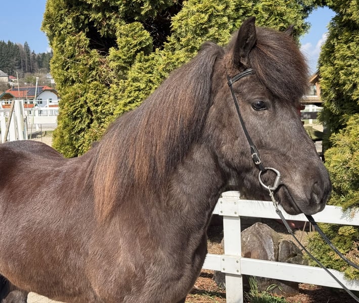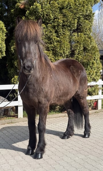 Pamela vom Barghof *2020 in Deutschland Rappe mit Stern viergängig geritten (Pass vorhanden) Stute, 1,42m groß entwurmt, geimpft, beschlagen✅ V: Gígjar frá Auðsholtshjáleigu 8,46 (Ext 7,98 Re 8,78)‼️ VV: Orri frá Þúfu 8,34 (Ext 8,08 Re 8,61)‼️ M: Pandra vom Barghof MV: Óðinn vom Barghof 7,86 (Ext 7,63 Re 8,09) 9,0 für Pass‼️ Pamela ist eine äußerst ansprechende Stute in sportlich-eleganter Optik und eine direkte Tochter des bekannten Gígjar frá Auðsholtshjáleigu. Sie bringt nicht nur ihr gutes Gebäude mit, sondern auch einen einwandfreien Charakter und ganz einfach zu reitende Gänge. Unter dem Sattel zeigt sie gute Mitarbeit, vier klar getrennte Gänge und eine solide Ausbildung. Ihr Tölt ist einfach zu reiten und lässt sich auch von weniger geübten Reitern abrufen. Sie kennt es allein als auch in der Gruppe ins Gelände zu gehen und ist hier eine sichere Begleitung. In neuen Umgebungen oder Situationen gibt sie sich gelassen und eher neugierig. Sollte sie etwas gruselig finden, bleibt sie stehen, schaut sich das „Objekt“ an und macht dann einen Bogen drumherum. Straßenverkehr, Kinderwägen, Hühner, Hunde, Radfahrer kennt sie bereits und nimmt das alles völlig gelassen. Beim Hufschmied, im Anhänger und beim geduscht werden verhält sie sich vorbildlich und macht alles geduldig mit. Dem Reiter gibt sie immer ein sicheres, gutes Gefühl und bringt ihn einfach nur zum lächeln, denn Pamela ist ein absolutes Spaßpferd. Unter dem Sattel ist sie ein echter Hingucker, denn sie weiß sich zu präsentieren und es dabei stets leicht in der Hand. Wir sehen die schöne Stute als tolles Freizeitpferd mit allen Möglichkeiten. Kurse, Wanderreiten, Züchten, Abzeichen und Turniere sind definitiv mit ihr denkbar. Kinder- und Jugendliche die bereits etwas reiten können, können Pamela sofort reiten. Sie kennt Herde und Boxenhaltung. Wer ein Pferd mit einem Herz aus Gold und guten Gängen sucht, wird hier fündig. Wer die schöne Rappstute kennen lernen und probieren möchte, kann dies gerne nach Absprache bei uns in A-5221 Lochen am See tun.