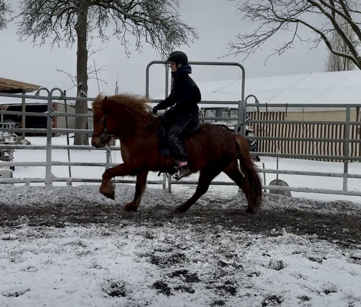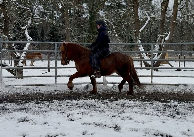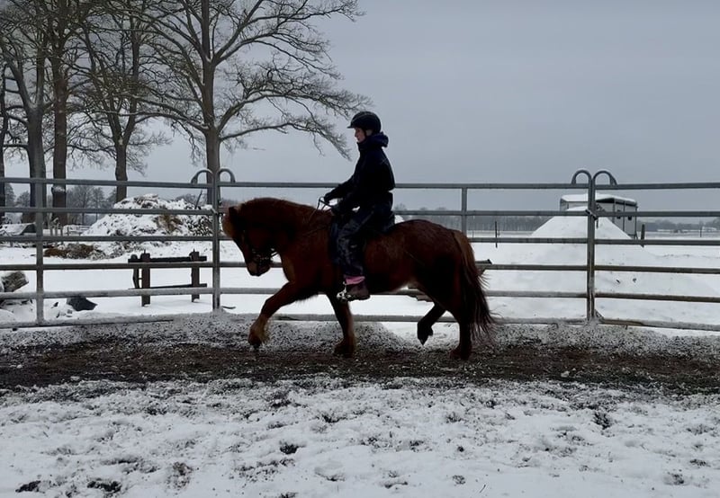 Nous vendons cette magnifique jument (d'origine allemande) pour le compte de son propriétaire. Née en 2020, elle a maintenant 6 ans. Elle a été monté de manière adaptée à son âge et en douceur par nos soins, et elle est prête à rejoindre une nouvelle famille. Tára convient aussi bien à des enfants avancés qu’à des adultes. Elle possède une belle allure régulière, avec une cadence très claire en Tölt et des allures de base très sûres. Grâce à sa conformation solide et sa stature robuste, elle convient parfaitement aux adultes. Elle a été montée en manège comme en extérieur, et nous la voyons continuer à évoluer dans le sport de loisir de haut niveau ou simplement pour le plaisir.