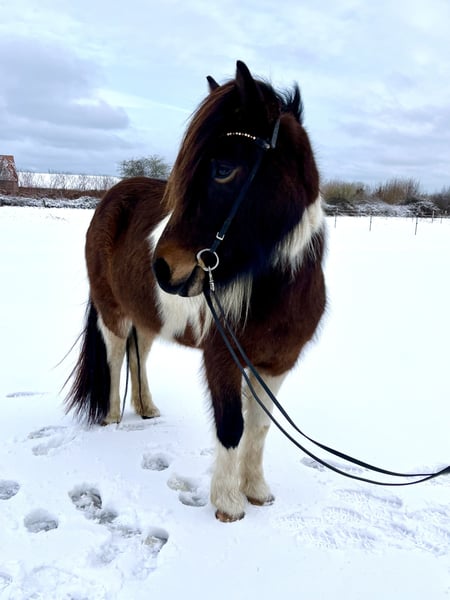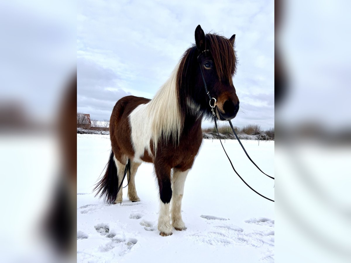 Örvun is an absolute eye-catcher with her long, dense mane, beautiful pinto markings, and feminine expression. As a foal, she was awarded a premium status, and her training was started at nearly five years old. She has been under saddle for two years now and has developed into a versatile leisure horse suitable for many riders. What makes her particularly appealing is that she always works motivated and diligently with her rider, happily participating in all exercises, yet she maintains very balanced gaits that allow the rider to sit comfortably without feeling overwhelmed. If you prefer a horse that doesn't require constant driving but still maintains a steady tempo, Örvun will feel like the perfect match. Örvun is naturally five-gaited, and we ride her in four gaits. She has a consistent gait pattern and an abundance of easy-to-ride tölt. She can töltingly cover long distances in the terrain with minimal rein contact. I often ride her one-handed and take my dog on a leash, which she doesn't mind at all. Her basic gaits are extremely comfortable, providing a pleasant riding experience. She also has a beautiful conformation, is very light in the hand, and responds well to rider cues without being overly sensitive, making her well-suited for dressage riding. She is confident on arena figures, familiar with common exercises, and even knows lateral movements like leg-yield in tölt. In the terrain, she is a reliable partner: she rides absolutely safely even alone in traffic, and in group rides, she remains calm and collected. She doesn’t need to be the leader but can also enjoy excellent rides alone. After a gallop across a stubble field, she remains manageable and does not become overly excited. Additionally, she is familiar with hand and lunging work, including cavaletti, free jumping, and hand-led rides in the terrain. All these activities are enjoyable with her. Örvun is ready for the upcoming season and versatile tasks with her new partner. She is of German breeding, free of eczema, kept in an open stable herd, healthy, fully vaccinated, regularly dewormed, and her teeth have just been checked. No allergies are known, and she tolerates hay, silage, straw, and pasture turnout. She is a straightforward horse to keep with no prior health issues. She comes directly from the breeder, where she was also trained (master operation, IPZV Trainer A).