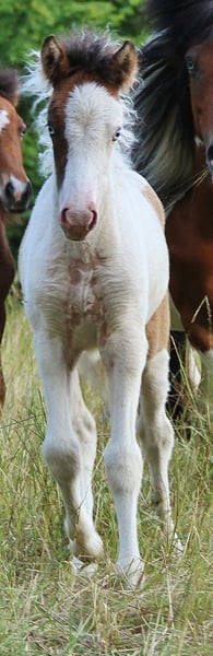 Bifröst, the rainbow or the gods' bridge from Earth to Heaven, is an individual mare foal with appealing quality and an excellent character. Due to a reduction, I am offering the chance to acquire this extraordinary filly. She has all the qualities to become a versatile riding and breeding horse in the future. Since her birth in May, she has grown up well-socialized in a functioning herd with regular human contact. Bifröst is healthy and free of eczema to date, from eczema-free parents. She is still with her mother but can be weaned at any time and move promptly to a new, loving, responsible home with other young horses. She is accustomed to humans, friendly, and curious. From birth, her hooves have been maintained as needed, and she is also regularly dewormed. Through pasture turnout with a horse trailer, she has learned to load and has been exposed to potential dangers in a positive way. Bifröst has a harmonious, slightly sporty yet stable build. Based on her parentage, she is expected to reach an approximate height of 14.0 hh with an elegant, strong exterior. Her mother is a large, strong mare registered in the first studbook, daughter of Heljar frá Brekknakoti. Heljar is currently the highest tested Helmschecke worldwide. Her father impresses with good gaits, a "Wow" factor, and a pedigree including Bekan frá Kolsholti 2 – a sport and riding horse suitable for everyone, qualified for Sport A, Skarði from Vindstaðir – world champion and Sport A, and Djarfur frá Lukkubæ – multiple German youth and junior champion, along with legendary breeding horses Glampi frá Vatnsleysu and Sveinn-Hervar frá Þúfu í Landeyjum. Bifröst herself is a five-gaited mare, and during her first months, she frequently exhibited natural tölt and occasionally pace while grazing. Her walk is rhythmically correct, and she now shows a secure and appealing trot. Her canter often has an uphill tendency. She displays all gaits with a lot of expression, joy of movement, space coverage, and good posture. She has a slightly higher temperament, although she usually behaves quite balanced. Bifröst is an extremely unique and pretty filly, distinguished by her distinctive pinto markings and two blue eyes. She is a guaranteed color producer, being a tested homozygous pinto, meaning all her offspring will be 100% pinto when used for breeding. Additionally, genetic tests confirm that she is a cremello and splash carrier. A true gem in terms of color genetics with a guarantee. Originally, I intended to keep her, so there are few photos and no videos available. However, she is very welcome to be personally introduced by appointment. Transport within Germany is possible upon arrangement. If you are genuinely interested in her, I look forward to hearing from you.