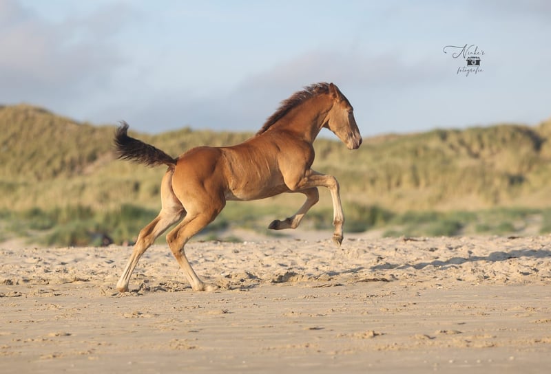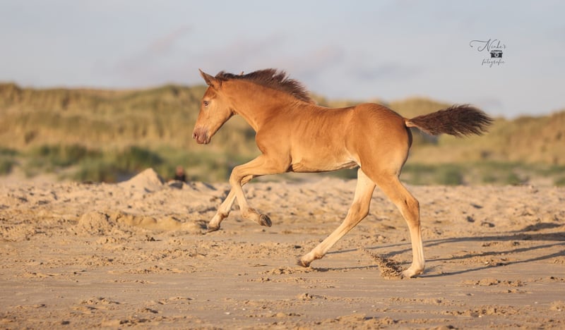 For sale: Beautiful filly Born on 30-05-25 She has a stunning amber champagne color and is expected to grow into a large mare just like her mother. She is being raised alongside her mother in a stable herd of various ages. This provides a nice and social foundation for the future. Pedigree: - Mother: Zep's Pixel van de Woodystables crossbreed Groninger horse x Icelandic – bombproof, strong, friendly, and versatile. Height 1.58 m. - Father: El Perrier van ‘t Pietershof - Perry 43.75% Arabian blood, and on the mother's side comes from a special gaited horse cross (Rocky Mountain x Paso). Height 1.52 m. Recently microchipped and registered with the EASP studbook. Characteristics: Healthy and curious character, very friendly. Beautiful build with strong legs. Unique color for enthusiasts. She is already used to many things such as forest and beach, picking up her feet, grooming, and walks nicely on a lead. Has already been on the trailer a few times with her mother. Possibility to test for DMRT3 (gaited). Location: Schoorl (nh) Price: upon request Feel free to come and meet this special foal. A great opportunity for anyone looking for a striking and sweet companion! Extra option: Currently, she is still staying with her mother, but she can be reserved with a deposit. Please message for more information or to arrange a viewing. Price negotiable, good home important.