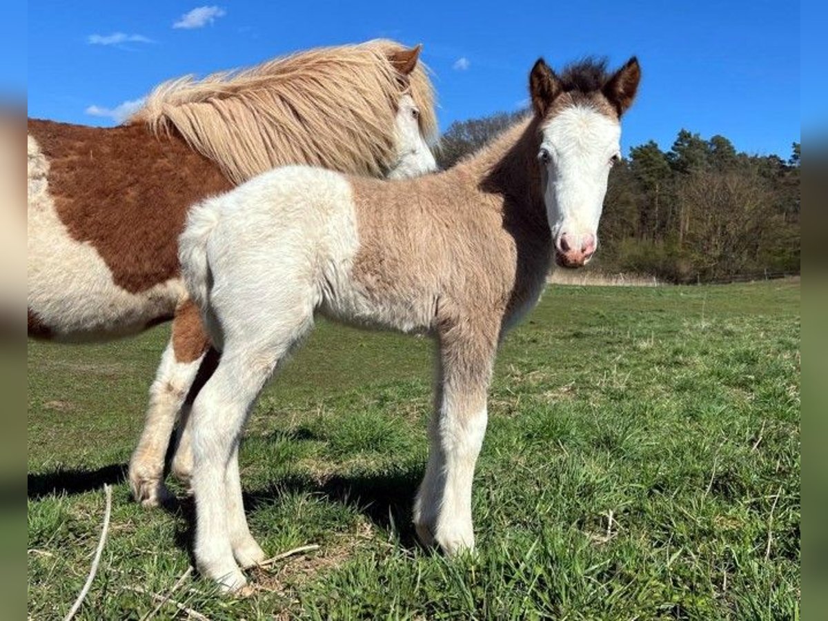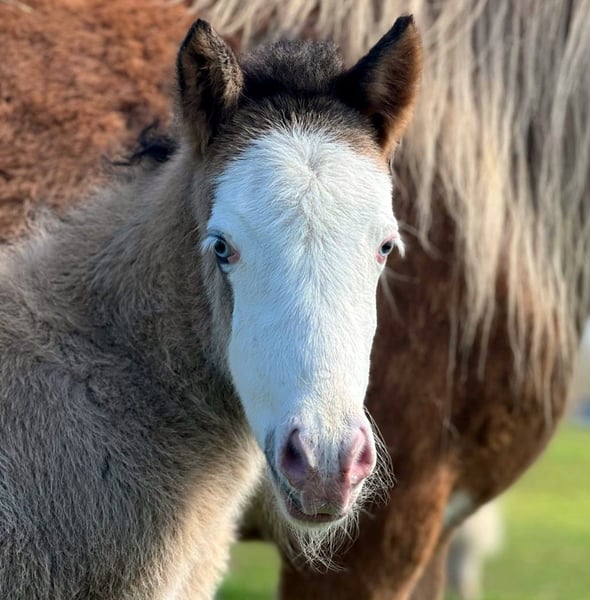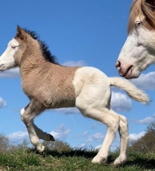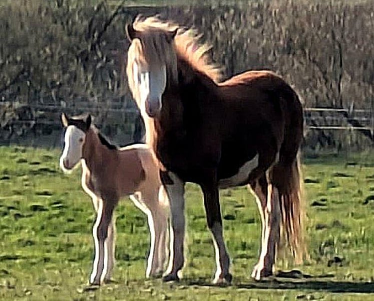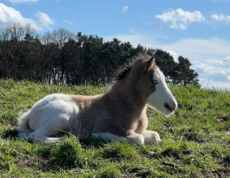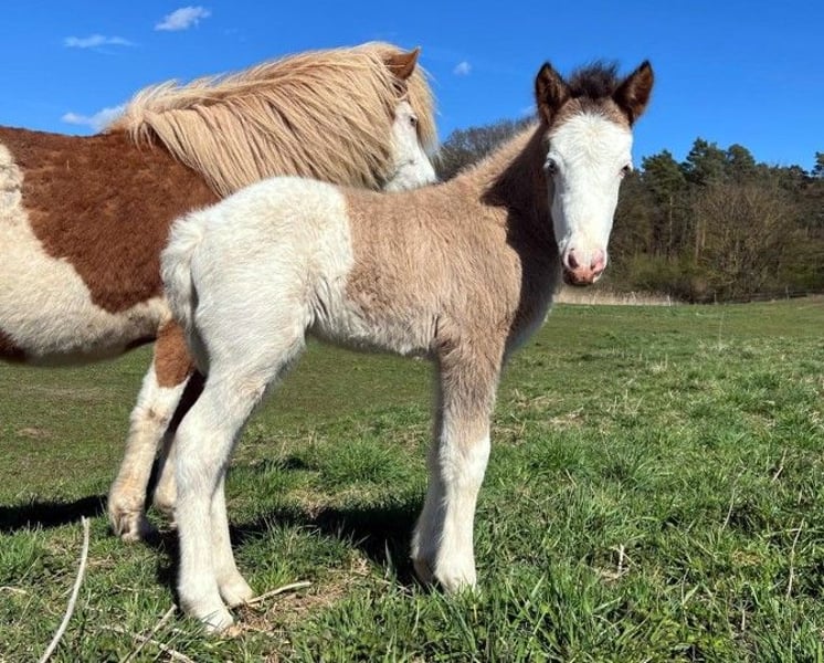 Stutfohlen Skessa *27.03.2026 Rappfalb-Helmschecke (kann verdeckt Cremegen tragen) V: Vingþór vom Holtdorftal (Rappfalb-Helmschecke) VV: Seðill frá Vatnsleysu VVV: Glampi frá Vatnsleysu VM: Villimey vom Queckenberg M: Skinna vom Holtdorftal (Fuchs-Helmschecke) MV: Dýri von Áladís MM: Skólahreysti frá Borgarnesi MMV: Skjanni frá Nýjabæ Aufgewecktes Stutfohlen, das schon kurz nach der Geburt den Tölt gezeigt hat und seitdem kaum zu bremsen ist. Zeigt keinerlei Scheu und erobert wissbegierig die Welt. Auch farblich kann die Süsse sich sehen lassen: Rappfalb-Helmschecke in schicker "Jacke", welches die Urväter des Splashs in sich trägt. Und somit ganz sicherlich einmal eine tolle Nachwuchsstute für die Zucht und vielleicht auch ein toller später Reitpartner. Das werden die Zeit, ihre weitere Entwicklung und die Zukunft zeigen. Skessa darf, wie bei uns alle Fohlen, jetzt erstmal ihre Zeit auf der Weide mit der Mama verbringen und die Welt erkunden und kann nach dem Absetzen im Herbst in ihr neues Zuhause umziehen. Bis dahin wird sie das Fohlen-ABC beherrschen, wird natürlich regelmässig entwurmt und erhält volle Papiere. Bis zur endgültigen Registrierung im Spätsommer hat der zukünftige Besitzer noch die Möglichkeit, selbst einen Namen für diese kleine Schönheit auszusuchen. Weitere Informationen, Fotos und Video auf Anfrage