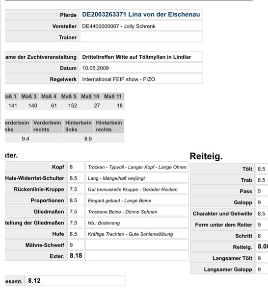 Father: Haukdal from Hafsteinsstödum, score: 8.64 Mother: Lina from der Elschenau, score: 8.12