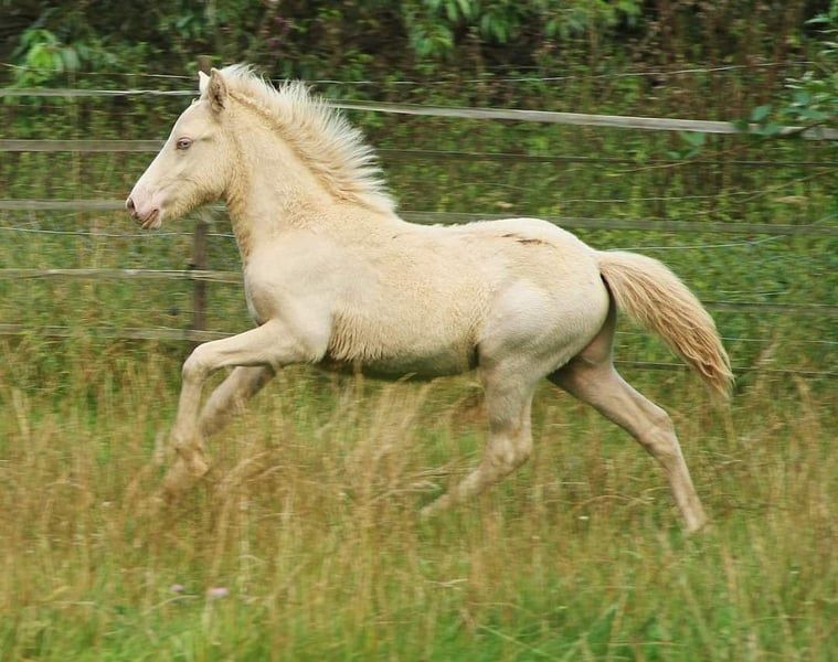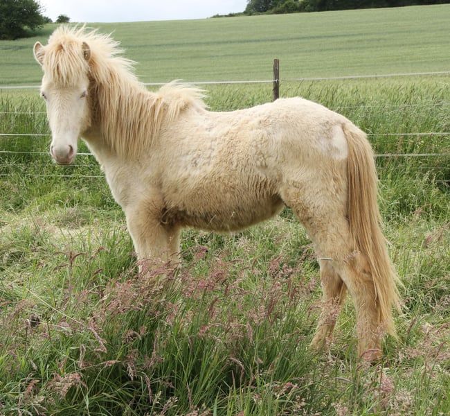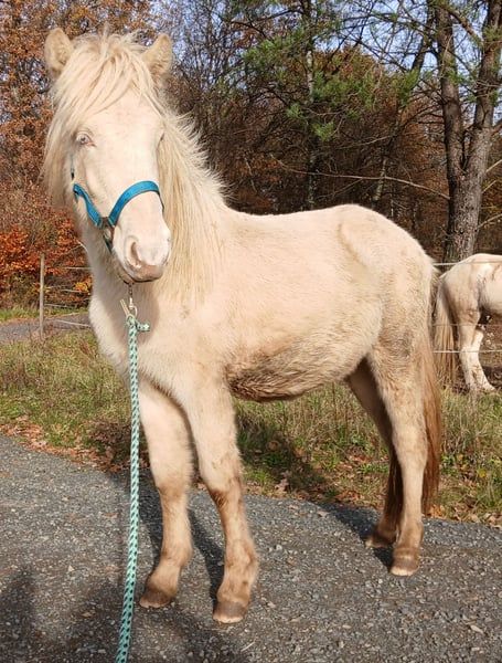 Fagurfifill ein heranwachsendes Traumpferd in Weiß mit blauen Augen - like a Unicorn Für kurze Zeit noch wegen Reduktion zum Fohlenpreis zu haben bei zeitnaher Abholung und Bezahlung noch im Januar. Kein Tausch. Er ist weiß geboren da er Doppelcreme = reinerbig Creme ist. Getestet wurde er als Perlino AaEe zusätzlich ist er mischerbig Schimmel N/G. Da er selbst schon weiß geboren ist hat das Schimmelgen auf seine eigene Farbe keine sichtbare Auswirkung. Fagurfifill überzeugt vom Tag seiner Geburt an mit seinem unkomplizierten freundlichen und vertrauensvollen Charakter. Er ist immer sofort bei einem, sucht den Menschenkontakt und ist auch an allem Interessiert was um ihn herum passiert. Vom Temperament zeigt er sich bis dato sehr ausgeglichen mit guter Lauffreude und stehts klarem Kopf. Durch seine Haltung kennt er viele Umwelteinflüsse und begegnet diesen jetzt schon relativ gelassen. Er wächst bis dato artgerecht und gut sozialisiert in einer altersgemischten Jungstruppe auf. Wird regelmäßig entwurmt, ist geimpft gegen Tetanus und Influenca, Ekzemfrei aus ekzemfreien Eltern, regelmäßig Hufe gepflegt- Hufpflegefromm, kennt die tägliche Gabe von Zusatzfutter mit Mineralfutter. Durch Weideumtrieb mit Pferdeanhänger von Fohlen an das Verladen und gefahren werden im positiven gewöhnt dadurch Verladefromm. Er ist mit seinen derzeit 1,5 Jahren gut Entwickelt und von Geburt an mit stabilem Fundament ausgestattet, natürlich jetzt als Jungpferd auch oft im Gebäude wachstumsbedingt nicht immer schön anzusehen, aber anhand seiner Eltern sollte er später mit harmonischem sportlich stabilem Gebäude und Endmaß um die 140 glänzen. Zudem hat er von seiner Mutter die mega Mähne geerbt, welche immer länger wird. Fagurfifill ist Fünfgangveranlagt mit ausgeprägten guten Grundgängen. Sein Schritt sauber vorhanden, die ersten Wochen nach Geburt hat er fast ausschließlich Tölt gezeigt und zeitweilig auch Pass. Seitdem er den Trab gefunden hat zeigt er diesen sicher, raumgreifend mit viel Schub und Tempofähigkeit. Je nach Tagesform ist der Tölt immer wieder mindestens in den Übergängen und mehr sichtbar. Sein Galopp ist für einen Fünfgänger gut ausgeprägt mit oft Bergauftendenz versehen. Ganglich bringt er viel Potential und wäre nicht nur ein zukünftiges gehobenes Freizeitpferd sondern bietet auch die Option auf Sport. Seine gute Abstammung ergänzt seine perfekte Mischung aus bestem Charakter und Gangvermögen. Es finden sich bei ihm hoch geprüfte Pferde wie der Álfur frá Selfossi Sohn Þórálfur frá Prestsbæ. Den Krákur frá Blesastöðum 1A Sohn Þorlákur frá Prestsbæ und Skjanni fra Nyjabae Sohn des Hróður frá Refsstöðum. Wie auch den bekannten Klettur frá Hvammi. Sein Stammbaum ist bis einschließlich den Urgroßeltern vollständig DNA bestätigt, erst dannach gibt es DNA-Lücken da nicht von allen Pferden DNA vorliegt. Fagurfifill kann auf Wunsch gegen Kostenerstattung noch bei mir Kastriert werden und nach Abheilung dann erst ins neue Zuhause umziehen. Beide Hoden sind abgestiegen vorhanden. Aktuell ist er recht plüschig, er kann gerne persönlich kennengelernt werden. Die Fotos sind von Fohlen bis Winteranfang 25. Es gibt lediglich nur das Fohlenvideo, weitere Videos sind derzeit organisatorisch und Platztechnisch nicht machbar. Bei echtem Interesse freue ich mich auf Nachricht. Ab 01.02.2026 wird er für 4800 € abgegeben, Preis mit weiterer Aufzucht steigend, um die bis dato angefallenen Kosten der Zucht/Aufzucht wenigstens decken zu können.