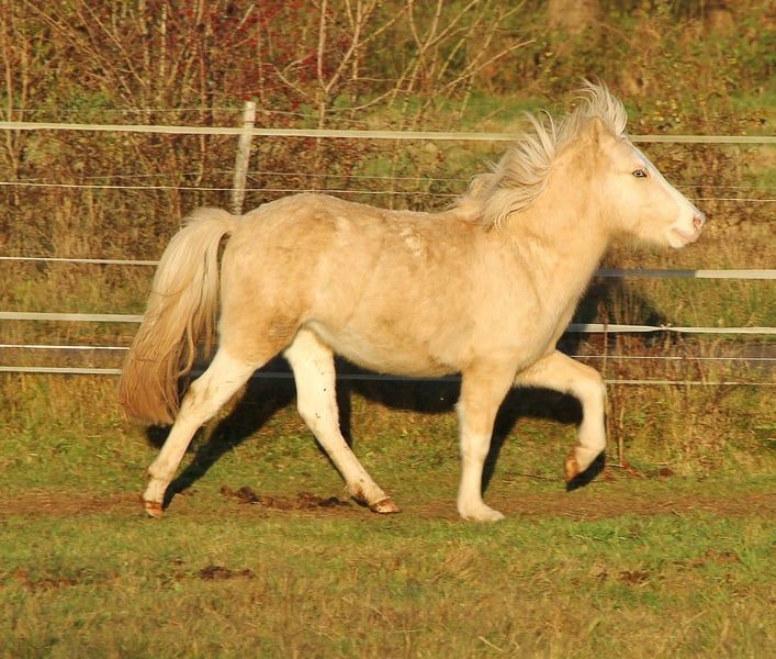 Dreymandi ist ein überaus schicker junger Palominohelmscheckwallach mit blauen Augen der durch seine seltene Farbkombination überall hervorsticht. Im Sommer wunderschön Goldpalomino ist er im Winter etwas heller vom Grundton aber genauso wunderschön. Besonders hübsch ist auf der einen Seite seine Sparzeichnung während die andere Seite etwas großzügiger bedacht ist . Mit seinen 3 Jahren ist er noch nicht fertig entwickelt und kann ein Endmaß von max. 139 Stm erreichen dabei ist sein Gebäude eher quadratisch robust gehalten. Charakterlich ein unkomplizierter freundlicher unartenfreier Schatz kennt er das jungpferdemäßige Händling und ist auch Hufpflege- und Verladefromm. Bis dato ist er gesund, Ekzemfrei, regelmäßig entwurmt, geimpft und Hufe gepflegt. Er ist gut sozialisiert in einer altersgemischten Jungstruppe aufgewachsen und steht auch derzeit ganz unproblematisch in dieser. Durch seinen Aufwuchs ist er die meisten Umweltfaktoren gewöhnt und begegnet diesen in der Regel offen und Schreckfrei. Als Fünfgänger zeigt er tagesformabhängig alle Gänge, dabei stechen seine guten, raumgreifenden und sicher vorhandenen Grundgänge besonders hervor. Immer wieder zeigt er Freilaufend auch Tölt und Pass mit gutem Tempo, Takt und schönen Bewegungen. Er bringt alles mit um später mit entsprechender Ausbildung das perfekte Allround Reitpferd für die ganze Familie inklusive Kinder zu werden. Sein Vater Sindri und seine Mutter Gletta sind erprobte sichere Allround Reitpferde für Jedermann und alle Gelegenheiten, egal ob gemütlich oder flott ins Gelände, Kurse, Turniere etc. auf sie ist immer Verlass egal ob der Reiter erfahren oder Anfänger ist. Dreymandi hat also die besten Voraussetzungen um als Nachwuchsreitpferd groß und klein zu Begeistern. Gerne kann er angeschaut und persönlich Kennengelernt werden, ein Umzug in ein neues Zuhause ist jederzeit möglich. Gerne kann der potentielle neue Besi eine Ankaufsuntersuchung durchführen lassen. Auch ein Transport ins neue Zuhause ist gegen Kostenübernahme innerhalb Deutschland möglich. Wir wünschen uns für ihn ein möglichst dauerhaftes Zuhause, dennoch ist ein Verkauf an einen Wiederverkäufer der ihn noch etwas Aufzieht und später nach Ausbildung weiterverkauft nicht ausgeschlossen, da dies ein späteres für immer Zuhause ja nicht ausschließt. Bei echtem Interesse freue ich mich auf nette Anfragen.