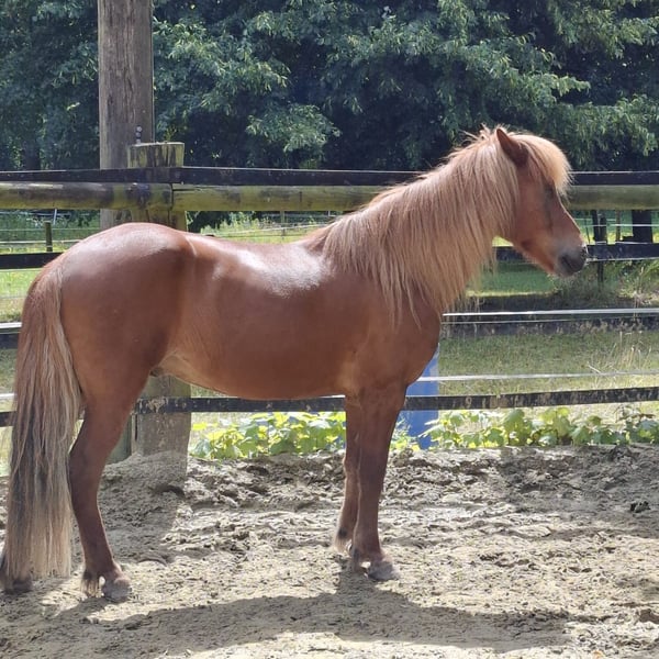 Te koop staat hier een 10-jarige, 1,43 m grote, stabiele en knappe vosmerrie (zonder aftekeningen) Gauti fra Langhusum, met heel veel manen 😀 Gauti is zeer nerveus, 100% betrouwbaar voor in de trailer, op de bak en buitenritten, en heeft bovendien heel comfortabele gangen. Zijn stap is ruim en krachtig, gevolgd door een rustige, lage-tölt, een zachte draf en alles afgerond met een lichte hand voor een prettig rijgevoel. De galop is iets gelopen en kan nog verbeterd worden. Door te uitademen, kan Gauti gemakkelijk afgeremd worden... over het algemeen moet hij vooral gemotiveerd worden, maar hij is zeer meewerkend. Zijn kracht ligt vooral bij buitenritten. Longeren, grondwerk en trailhindernissen zoals een opstap, brug en stangenwerk doet hij kalm en ontspannen. Net zo makkelijk is hij als een vrolijk en perfect handpaard. Hij laat zich graag knuffelen en blijft daarbij rustig staan. Bij ons staat hij probleemloos samen met hengsten en merries in de groepsstal. Tijdens het voeren is hij makkelijk in de omgang; 24 uur weidegang vind ik over het algemeen te veel en zou ik voor Gauti niet aanraden. Ik wens voor Gauti een recreatieve ruiter die hem afwisselend bezig houdt en graag buiten rijdt. Ik heb Gauti op hoefbeslag gezet, in het terrein draagt hij hoefbeschermers. Gauti is gevaccineerd, ontwormd, eczeemvrij en heeft een recente RX met röntgenfoto’s (alles in orde). Zijn tanden zijn in maart 2025 verzorgd en in december 2025 is hij osteopathisch behandeld. Een passende zadel van Eques, samen met andere accessoires, kan eventueel mee worden gekocht. Gauti kan bij ons in de binnenbak of buitenritten uitgebreid getest en leren kennen worden. Voor verdere vragen ben ik graag telefonisch bereikbaar: mobiel 0152/54385267