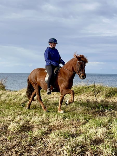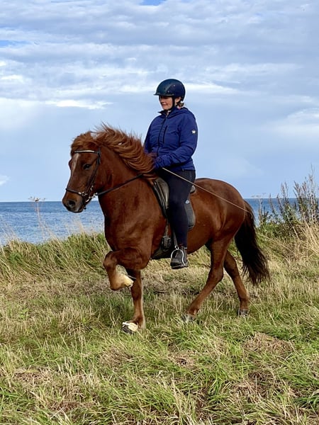 Rúbín ist ein fünfgängig veranlagter Wallach, der viergängig geritten wird. Er ist traumhaft zu reiten, weil er zum einen unbeschreiblich leichtrittig (am kleinen Finger zu reiten) ist und zum anderen so freundlich und lieb ist, dass es eine Freude ist, mit ihm zu arbeiten und ihn reiten zu dürfen. Ein richtiges Luxusreitpferd! Rúbín hat sehr gleichmäßige und dabei schicke Gänge, die alle ganz leicht zu reiten und sicher abrufbar sind. Sein Tölt ist ein Traum und sein Galopp weich und schön gesprungen. Schritt und Trab sind ausdrucksvoll und sicher. Es gibt nichts, was man mit Rúbín nicht machen kann. Durch seinen sehr guten Ausbildungsstand und seine Leichtrittigkeit lässt er sich herrlich dressurmäßig arbeiten oder auf der Ovalbahn in den schicken Gangarten trainieren. Aber am allertollsten ist mit ihm das Reiten im Gelände! Rúbín ist absolut sicher allein aber auch in kleinen und großen Gruppen auszureiten, dabei immer regulierbar und trotzdem fröhlich sprudelnd, auch Straßenverkehr macht ihm nichts aus, er ist einfach eine sichere Bank. Er hat ein mittleres Temperament und macht immer so viel, wie sein Reiter es verlangt. Rúbín ist für viele unterschiedliche Reiter passend: ein ambitionierter Reiter gleich welchen Alters hätte einen wunderbare Partner an seiner Seite, sei es für stressfreies und sicheres Ausreiten, Reitunterricht und Kurse bis hin zu Abzeichen- und Trainerprüfungen oder auch als Partner im Sport. Auch ein Kind mit etwas Reiterfahrung käme mit ihm zurecht. Weil er so gut ausgebildet und fein zu reiten ist, wünschen wir uns für ihn keinen absoluten Anfänger als Reiter. Er wird wegen Studiums von privat im Auftrag verkauft.