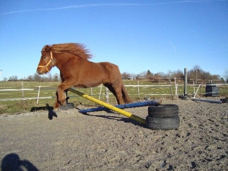 SINDRI, hübscher, temperamentvoller Fuchswallach mit Fuchsmähne, 12 Jahre, 1,43 m Stockmaß, Charakterpferd, sehr neugierig, wach und interessiert an allem, schwunghafter Trab und Galopp, sehr gute Töltveranlagung, liebt Zirkuskunststücke und abwechslungsreiche Bodenarbeit u. Reiten u. Springen auf dem Reitplatz, ist beim Ausreiten durch sein schwungvolles Temperament eher für jugendl. Fortgeschrittene und Erwachsene geeignet. Er ist sehr vielversprechend und ausbildungswillig für Tölt- und weitere Dressur- und Springausbildung. Zudem ist er sehr sensibel und verschmust, sowohl zu seiner Schwester Suraja und allgemein zu seinen ihn umgebenden Menschen. . Er ist ekzemfrei, Barhufgänger und kann auch längere Fahrten im Hänger durchstehen. Sein rechtes Auge hat eine Netzhautablösung, aber sein Auge ist noch nicht erblindet. Daher macht er alles mit, rechte Hand wie auch linke Hand. Ein sehr gut passender, qualitativer Sommer-Sattel wird mitgereicht. Da er sehr bewegungsfreudig ist, braucht er unbedingt große Weiden und einen Offenstall. Sindri kann ohne Gebiß und mit Gebiß geritten werden. Zur Zeit lernt er gerade den Tölt.