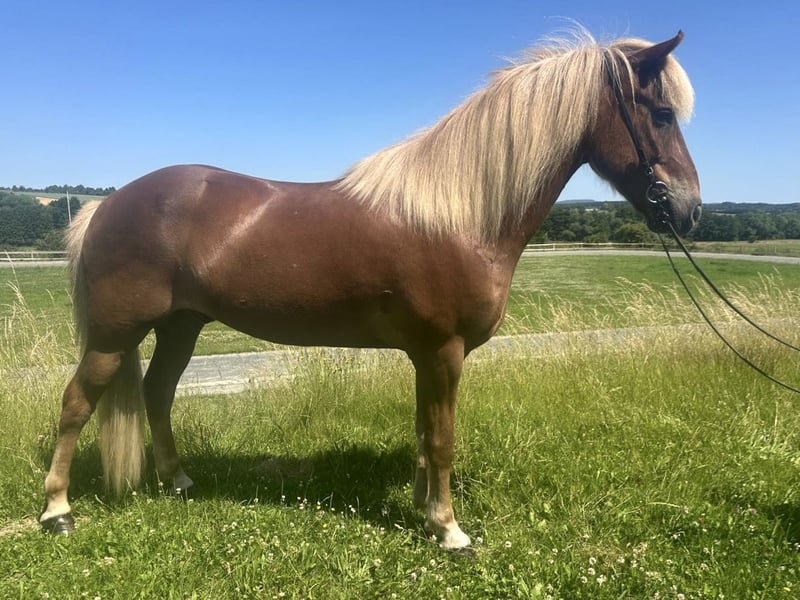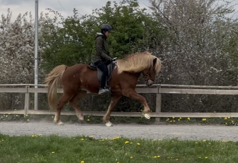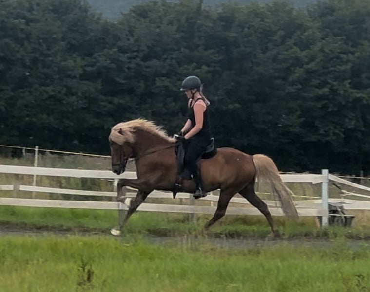 Hyllir frá Dverghamri ist ein 2013 geborener großer Fuchswallach. Er verfügt über einen sehr schönen Tölt in allen Tempi, mit dem er sofort in T3/T4 einsetzbar wäre. Sein Galopp ist gut gesprungen, sein Trab ist sicher mit weiten Bewegungen und er steht immer fein an den Hilfen. Er hat viel Lauffreude, ist aber bei routinierten Reitern immer problemlos zu regulieren und bringt immer einen tollen Arbeitswillen mit. Im Gelände ist er sowohl alleine als auch in der Gruppe zuverlässig. Charakterlich ist er einfach unkompliziert, sehr höflich im Umgang und auch in der Herde sehr leicht zu integrieren. Hyllir ist für alle Reitabzeichen sehr gut einsetzbar und auch für Trainerlehrgänge gut geeignet. Auch kann ich mir ihn gut als Jugendsportpferd vorstellen. Da ich ihn leider aus persönlichen Gründen abgeben muss, suche ich ein bestmögliches zuhause für ihn. Er ist gesund, ekzemfrei und absolut schmiede- und verladefromm. Weitere Infos und Videos auf Anfrage.