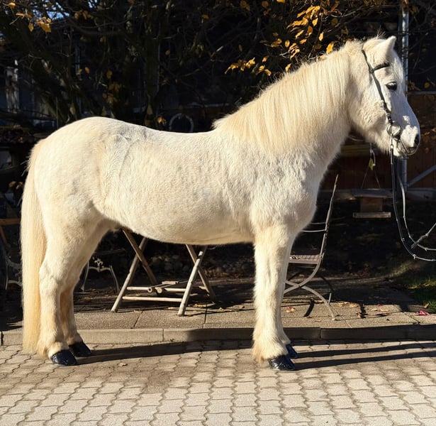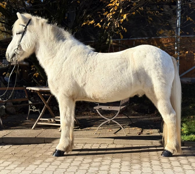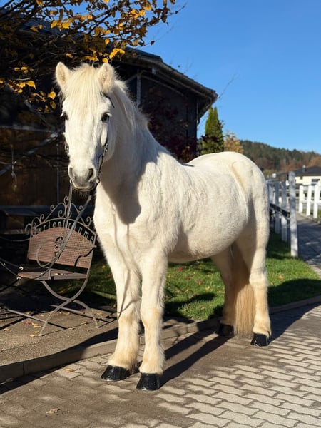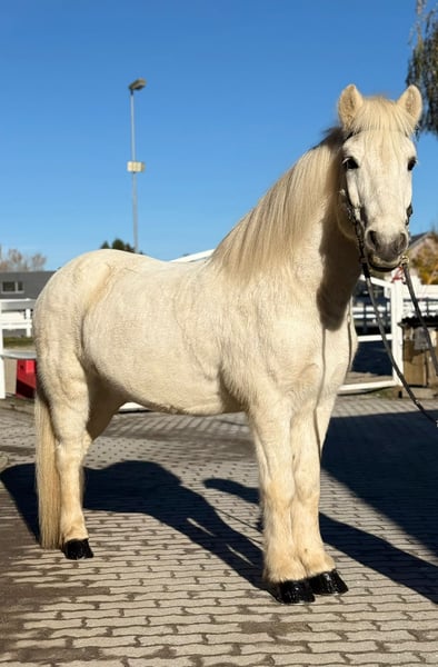 Hvellur from Hvammi Gelding, born in 2012 in Iceland Height: 144 cm Ekzem-free Four-gaited Shoed, dewormed, and vaccinated Sire: Klængur frá Skálakoti 8.38 (Ext 8.39, Re 8.38) ‼️ Dam: Gnýr frá Stokkseyri 8.26 (Ext 8.21, Re 8.29) ‼️ Granddam: Linda frá Hvammi 7.76 (Ext 7.76, Re 7.75) ‼️ Great-granddam: Klettur frá Hvammi 8.49 (Ext 8.43, Re 8.54) ‼️ Hvellur, affectionately known as "Eisbär," impresses not only with his solid and powerful build but also with his friendly and cuddly nature. He stands completely calm and relaxed at the hitching post, loves grooming and cuddling, and can’t get enough of gentle strokes. His gaits leave nothing to be desired: – a steady, rhythmical walk, – a lively, expressive trot, – an easy-to-ride tölt with engaging movement, – as well as a beautifully sprung, balanced canter. Like all our horses, he is trained five times a week (under saddle, lunged, on the arena, in the indoor riding hall, in the round pen, and in the field). Hvellur didn’t have the easiest time with his previous paddock mate, who was very dominant and assertive. Therefore, this sweet boy is looking for a new home. We have known Hvellur for a long time and remember him as very social and uncomplicated with other horses. He currently shares a paddock box with a gelding and feels completely at ease. We are looking for an ambitious leisure rider for Hvellur, someone who enjoys riding good gaits, working in varied exercises, and wants a partner who will stand by him through thick and thin. He is open to all kinds of fun. If you would like to be enchanted by this adorable "Eisbär," please contact us to arrange a trial ride in A-5221 Lochen am See.