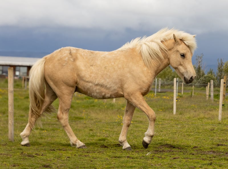 Ce jeune hongre palomino allie beauté, caractère amical et bons mouvements. Né en 2023, il est bien sociabilisé et manipulé. Il a un tempérament calme et curieux. Il montre du tölt et du trot, mais il peut également être à cinq allures. Le père est un étalon à cinq allures avec un total de 8,32 points. La mère est une jument à quatre allures, fille de Kaspar frá Kommu (total de 8,4 points) et est entraînée en halter. Nous pouvons aider avec l'exportation.
