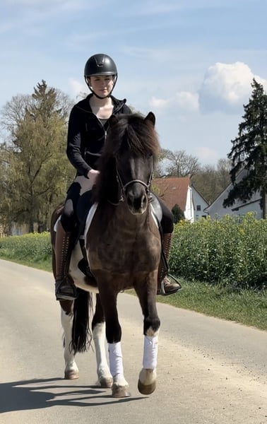Wunderschöner großer Isländer Wallach, 5 Jahre, großrahmig, viergängig, supercool mit traumhafter Scheckung Manchmal kommt ein Pferd, das einfach alles mitbringt: Charme, Charakter, Talent, Größe und absolute Coolness. Dieser bildhübsche 5 jährige Island Wallach, in Deutschland geboren, begeistert nicht nur mit seiner wunderschönen harmonischen Scheckung sondern vor allem mit seinem einzigartig ausgeglichenen und freundlichen Wesen. Mit aktuell ca. 1,44 m Stockmaß und einem geschätzten Endmaß von etwa 1,48 m ist er ein sehr großer, kräftiger und großrahmiger Isländer, der auch für größere Reiter hervorragend geeignet ist. Er ist ein echtes Traumpferd für Freizeitreiter, ambitionierte Töltliebhaber und alle, die ein nervenstarkes Verlasspferd suchen. Charakter, einfach ein Goldschatz Dieser liebe Wallach ist ein Pferd, das durch seine innere Ruhe und Gelassenheit begeistert. Er ist: • supercool • ausgeglichen • menschenbezogen • freundlich • verspielt mit Artgenossen • bestens sozialisiert • neugierig und lernfreudig Besonders beeindruckend ist seine Einstellung zu allem Neuen: Er liebt es, unbekannte Situationen zu entdecken und bleibt dabei entspannt und souverän. Gerade im Gelassenheitsparcours zeigt er seine absolute Stärke. Hier ist er mit Freude, Neugier und großer Coolness bei der Sache und lässt sich nicht aus der Ruhe bringen. Ausbildung, sicher viergängig mit tollem Tölt Aktuell ist er klar viergängig geritten und überzeugt besonders durch seinen sicheren, angenehm zu sitzenden Tölt. Sein Galopp ist super durchgesprungen und leicht regulierbar. Er lässt sich am komplett durchhängenden Zügel im Galopp entspannt weiterreiten, ohne dabei das Tempo zu steigern. Das macht ihn gerade für Reiter interessant, die ein bequemes, leicht zu regulierendes und nervenstarkes Reitpferd suchen, welches ein gewisses Maß an Sicherheit vermittelt. Er zeigt dabei bereits: • eine gute Balance • viel Übersicht • eine tolle Arbeitseinstellung • entspannte Lauffreude • Talent für mehr Hier wächst definitiv ein Pferd heran, das nicht nur ein fantastisches Freizeitpferd sondern durchaus auch für weitere Förderung sehr interessant ist. Gelände, entspannt und zuverlässig Er war bereits mehrfach mit im Gelände und hat dort ebenfalls absolut überzeugt. Neue Wege, Umweltreize und unterschiedliche Situationen hat er durchweg souverän und easy gemeistert. Er zeigt sich mutig, gelassen, aufmerksam, sicher, unkompliziert. Schon jetzt ist er ein herrliches Ausreitpferd, das seinem Reiter ein tolles Gefühl von Sicherheit vermittelt. Haltung & Alltag Er ist in Deutschland geboren und kennt robuste 365-Tage-Draußenhaltung, was ihn zu einem gesunden, ausgeglichenen und hervorragend sozialisierten Jungpferd gemacht hat. Selbstverständlich ist er, schmiedefromm, verladefromm, ekzemfrei, unkompliziert im täglichen Handling und absolut verträglich in der Herde Fazit Ein außergewöhnlich sympathischer, großrahmiger und wunderschöner Islandwallach, der bereits jetzt durch Rittigkeit, Coolness, Töltqualität und Charakter begeistert. Ein Pferd für Menschen, die nicht einfach irgendeinen Isländer suchen, sondern einen echten Partner fürs Leben mit Talent, Verlassqualität und ganz viel Herz. Ein Traumpferd in jeder Hinsicht. Für einen Termin mit Vorreiten und Probereiten berechnen wir 40€, die beim Kauf des Pferdes selbstverständlich erstattet werden. Hierfür bitten wir Sie um Verständnis. Bei Interesse und Rückfragen melden Sie sich gerne telefonisch oder per WhatsApp unter 049(0)1709343872