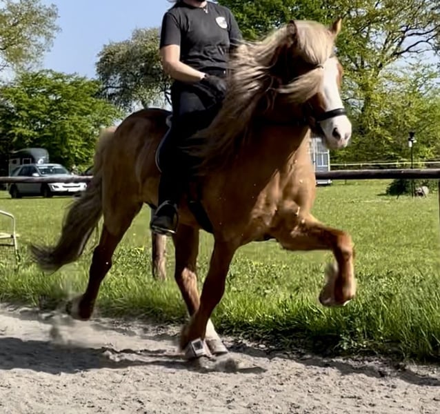At 7 months old, Gulliver from Iceland came to me, and as a stallion, he grew up both in a stallion group and on large pastures within big herds in Schleswig-Holstein. Approved by the HH/SH horse breeding association, I decided to geld him at the age of 6. His magnificent, thick, curly mane has remained. His striking blue eyes make this horse unmistakable. Character-wise, he is an absolute sweetheart. Currently ridden by a young rider, he also behaves perfectly well with children. In the future, he could be a horse that provides great pleasure both in the terrain and in the arena, and with appropriate training, he could excel in four-gait and Tölt competitions. As a stallion, he was once presented for futurity, and at 6/7 years old, he was shown with a V5/T7 rating, including wins and placings. Fearless, social within the herd (lives with geldings in an open stable), and completely uncomplicated in every way. Vaccinated, dewormed, etc., naturally. Videos are available upon request.