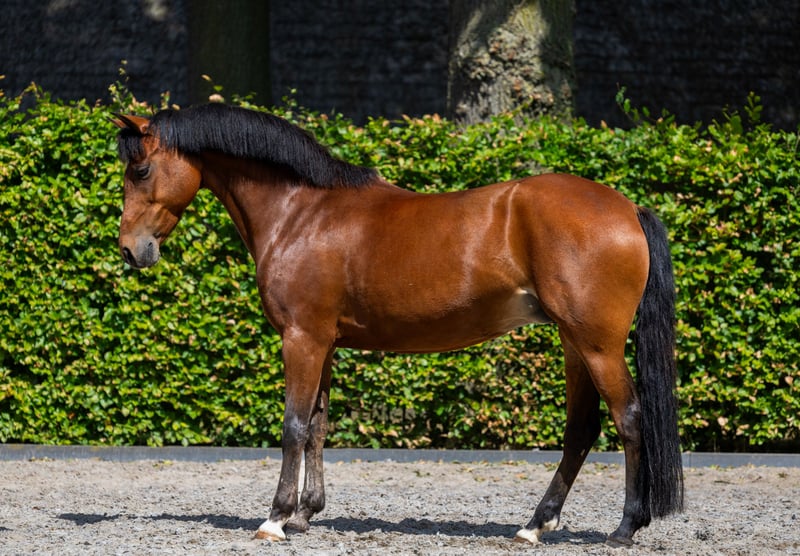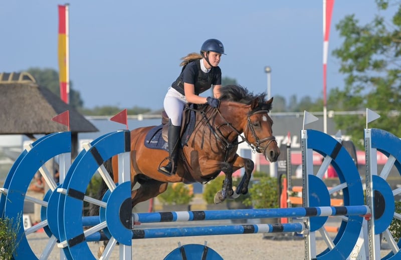 Liebe D, Stute, 146 cm, ist in der Klasse 1.10 m eingestuft. Sie ist eine ruhige Stute, die man bequem an der Hand führen kann – ein kleines Kind kann sie problemlos ein- und ausstellen. Im Springstadion ist ein erfahrener Reiter wünschenswert. Sie ist eine Stute, die gerne die andere Seite erreichen möchte, aber auch schnell ist. Sie hat bereits zahlreiche Preise gewonnen.