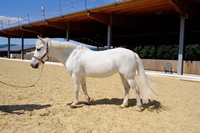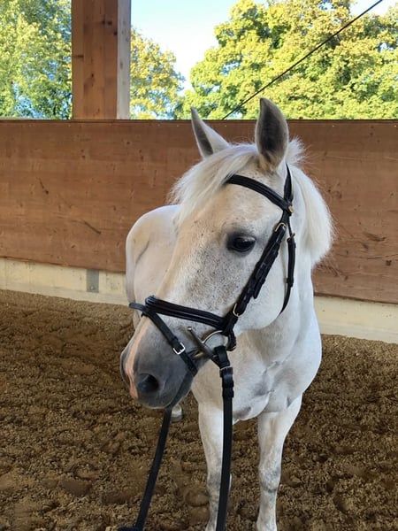 Are you dreaming of an elegant partner in equestrian sport who knows how to convince both in the show jumping course and in the dressage arena? Meet Silver, the 16-year-old grey mare who combines experience and elegance. Their outstanding features: - Versatile talents: Silver has not only gained experience in show jumping, but also attracts everyone's attention in the dressage arena. With its three impressive and comfortable gaits, it fascinates every connoisseur. - Experienced and reliable: Silver excelled in our riding school. She knows exactly what she has to do on the course and has enough "go" to help ambitious young riders advance in show jumping. However, it is not suitable for beginners or anxious riders. - Impeccable character: In daily dealings, Silver is uncomplicated and well-behaved. Be it with the farrier or loading, she always shows her best behavior. Things to know about Silver: - Social Mare: During the day, Silver enjoys being in the paddock in the company of other ponies. She shows herself to be a higher-ranking mare. - Special feed needs: It is important to note that silver needs wet or steamed hay. Otherwise, she may react with a coughing stimulus. Silver is an impressive grey mare who knows how to shine in dressage as well as in show jumping. With her experience and elegance, she is the perfect partner for ambitious riders who are ready to take their skills to the next level. If you would like to take full advantage of Silver's potential and offer her a loving home, please contact us for more details and viewing appointments. We are convinced that Silver and her new rider can become an unbeatable team.
