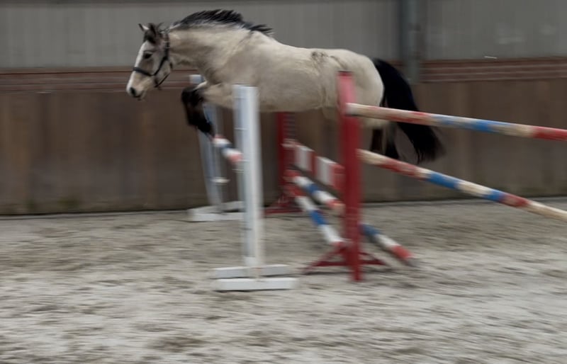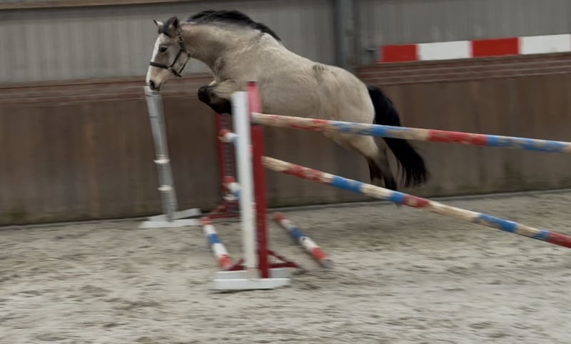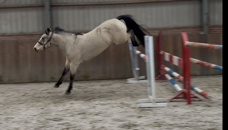 Door inruil verkregen deze schitterende allround D pony. ‘Vikki’ is een opvallend mooie D pony merrie. Ze beschikt over een mooie valk/isabelle kleur. Ze staat correct op haar benen en heeft veel body. Ze kan netjes bewegen en zeer goed springen. Ze kan een klein parcoursje rond springen. Ze heeft een frans paspoort en haar vader is een Newforest. Bij interesse graag bellen of appen op telefoonnummer: +31643197337
