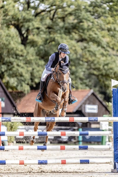 Poiché il mio tempo con il pony quest'anno sta per finire, vendo il mio pony Orchid’s Raimond. È arrivato da noi nel 2022 e ho cavalcato con lui da livello E fino a M nel salto ostacoli. Lui lotta sempre per il suo cavaliere in campo e è perfetto per stile e salto contro il tempo. "Fire" mira sempre a fare zero penalità e aiuta il suo cavaliere anche quando qualcosa non va perfettamente! È agile, veloce di base e ha numerosi piazzamenti dal livello E all'M nel salto ostacoli. Ad esempio: • Vincitore del CWD Kids Cup 2023 (A** con barrage) • Vincitore della classifica generale della Pony-Trophy Tour 2024 (3° posto in finale nel 115 cm con barrage) • Campione del distretto nel 2022, 2023 e 2025! • Vincitore al Turnier der Sieger a Münster (110 cm con barrage) • Vittoria internazionale nel 110 cm a Hagen + altri piazzamenti internazionali • Piazzamento internazionale nel 115 cm a Peelbergen • 2° posto nel 120 cm al pony tournament di Xanten È un vero e proprio collezionista di coppe e si può sempre contare su di lui! Viene venduto solo a persone di assoluta fiducia! Per interesse o ulteriori informazioni, sono a disposizione. Visite e prove di monta su appuntamento. Telefono: 0173 8736775