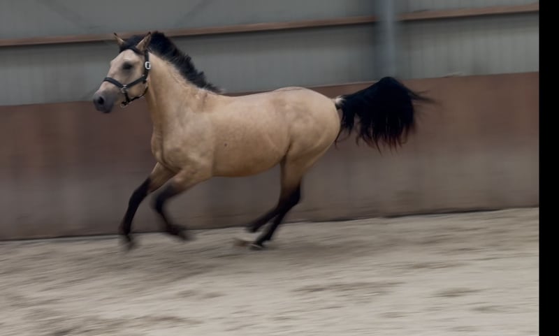 Tribunolas is a very beautiful specimen. Not only because of his lovely color, but also due to his appealing type and appearance. He currently stands at a height of 1.53m. He possesses three good basic gaits. He moves with great suppleness and good leg technique. He can also naturally change leads easily. His first free jumps are promising. He shows a lot of athletic ability. He jumps with quick reflexes and good technique, consistently finishing well behind the jump. He was castrated about 6 weeks ago. Tribunolas has not yet been backed. However, he is honest in handling and has a curious and level-headed character. Please call or message if interested. A video is available. Phone: +31(0)643197337