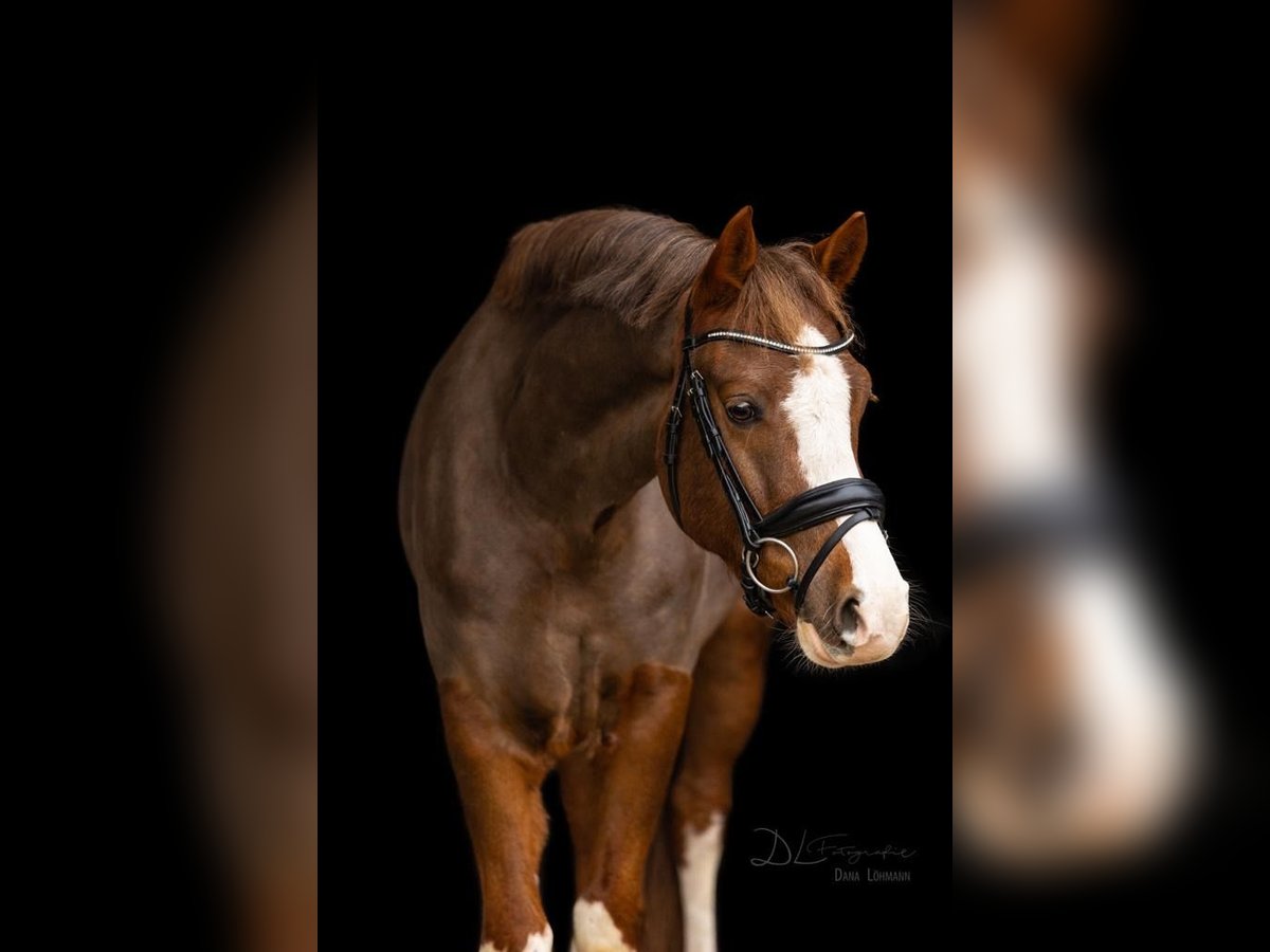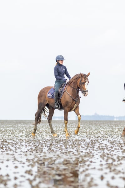 For sale is our handsome 9-year-old pony gelding, "Murphy" (Elroud de Luxe), sired by Esse Golden Bigwig out of Verdi. With his distinctive blaze and white legs, he is truly eye-catching. Despite his jumping-oriented pedigree, Murphy offers three good basic gaits, with his canter being particularly impressive. We purchased him as a well-broken four-year-old, and he was subsequently trained in a versatile manner by a young girl with professional support. He has competed successfully in dressage and jumping tests up to class E/A, as well as in smaller eventing competitions, earning numerous wins and placings. In handling, Murphy is well-behaved and uncomplicated—both under saddle and in daily grooming. He is accustomed to hacking alone and in groups. Within the herd, he ranks high. Murphy is a reliable partner for leisure riding and sport. We can also see him as part of a mother-and-child pair. He is not offered as a school pony. Since Murphy occasionally shows his tongue when ridden, he is offered below value. Further information and videos are available upon request at: 0152 05101046. To prevent trail riding, we charge €20 for a trial ride, which will be credited towards the purchase price.