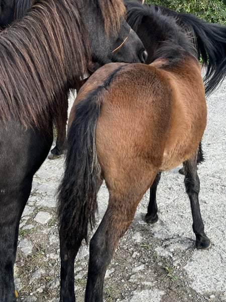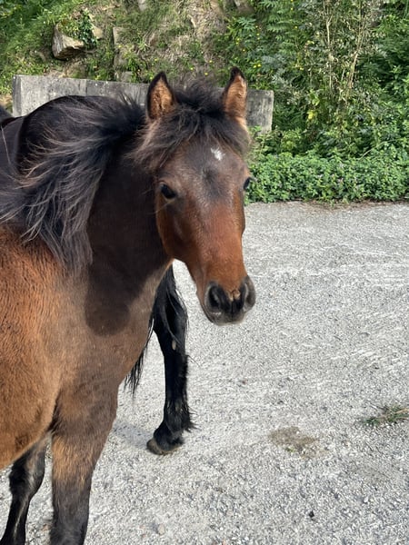 Ponny, geboren im April. Vater ein Mischling aus Pottoka und Araber. Mutter eine reine Pottoka.