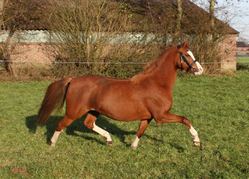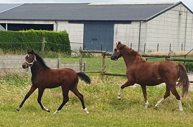 Beautiful Welsh NWR filly offered for sale. Born in April 2025, gelded since September 17, 2025. The foal is handled daily and has already been treated twice by the farrier. This foal has immense potential for sport as well as for the show ring. Mother is a Welsh B mare, 133 cm, with exceptional movement and jumping ability (second to last photo). Father is A New Story, Welsh NWR, 145 cm, currently making waves as a sensation with incredible potential! (last photo).