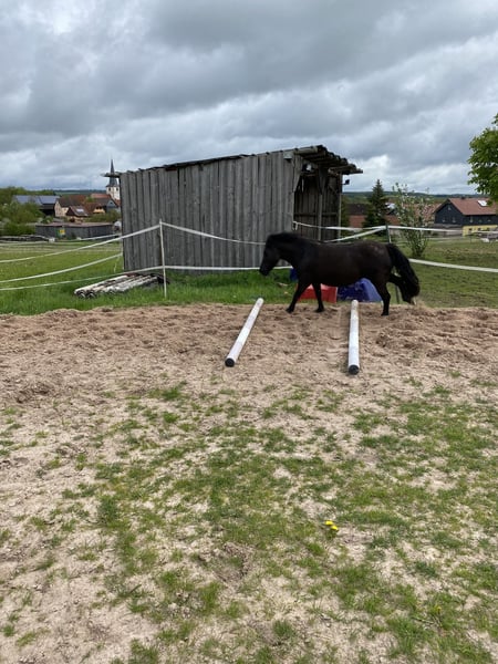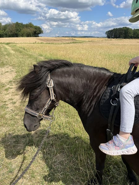 Our pony is looking for a new home, as she has been bullied by the larger mares for quite some time, which now sometimes requires us to separate her. She lives outdoors year-round with a paddock and pasture but is also familiar with stabling. She is very easygoing, strong-willed, affectionate, and friendly. Whether in a mixed herd or with only mares, she adapts well. She has experience with both. She has always been healthy, no signs of laminitis! Regularly dewormed, vaccinated, with teeth and barefoot care. She has a green passport and is microchipped. A place as a companion pony or as a lead-rein pony for children would be ideal.