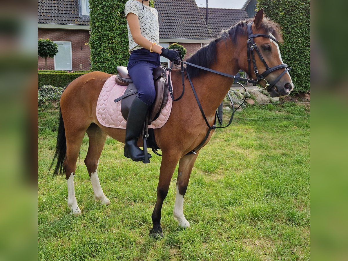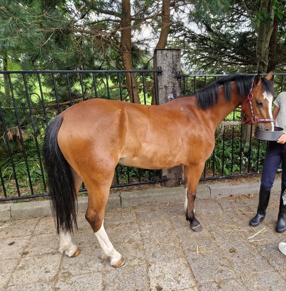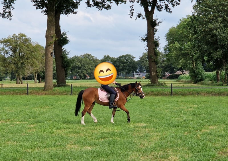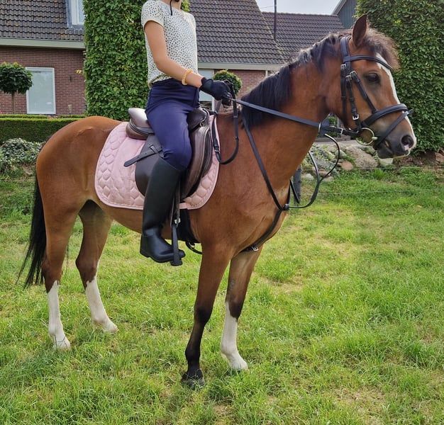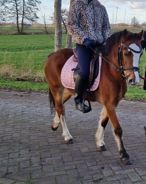 Mooie 5 jarige Welsh merrie (Celeste), stokmaat 1.17m. Blackhill Domino x Sunshine Zoë Wordt verkocht ivm overstap naar D pony. Ons jongere dochtertje wil ook graag rijden maar heeft nog geen ervaring en daar is deze pony nog te jong/pittig voor. We zoeken voor haar dus een wat oudere ervaren pony (ruilen tegen een ervaren b of c pony is daarom ook bespreekbaar). Dochter van 11 heeft er een jaar recreatief op gereden, een sprongetje en buitenritten maar geen wedstrijden gereden omdat ze eigenlijk wat aan de grote kant was voor deze pony, daarom nu dus ook overgestapt naar grotere pony. Pony moet wel echt weer opgepakt worden omdat er laatste jaar amper op gereden is daarom ook gunstig geprijsd. Pony heeft een tijdje alleen gestaan maar is merkbaar gelukkiger met een maatje erbij dus dat heeft dan ook echt onze voorkeur. Loopt overdag in wei met andere pony, 's nachts op stal. Ivm wat gevoelig voor hoefbevangenheid in voorjaar weidegang beperkt.