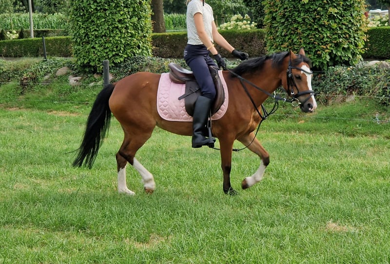 Schöne fünfjährige Welsh-Stute (Celeste), Stockmaß 1,17 m. Blackhill Domino x Sunshine Zoë Wird verkauft aufgrund eines Wechsels auf eine D-Pony. Unsere jüngere Tochter möchte auch gerne reiten, hat aber noch keine Erfahrung, und dafür ist dieses Pony noch zu jung und etwas temperamentvoll. Wir suchen daher für sie ein etwas älteres, erfahrenes Pony (ein Tausch gegen ein erfahrenes B- oder C-Pony ist ebenfalls möglich). Die elfjährige Tochter hat ein Jahr lang Freizeit geritten, Springen und Ausritte unternommen, aber keine Turniere, da sie für dieses Pony eigentlich etwas zu groß war. Deshalb ist sie jetzt auf ein größeres Pony umgestiegen. Das Pony muss jedoch wieder aufgebaut werden, da es im letzten Jahr kaum geritten wurde, daher ist es auch preislich günstig. Das Pony stand eine Zeit lang alleine, ist aber deutlich glücklicher mit einem Artgenossen, weshalb das unsere bevorzugte Lösung ist. Tagsüber steht es mit anderen Ponys auf der Weide, nachts in der Stallung. Aufgrund einer leichten Anfälligkeit für Hufrehe ist die Weidezeit im Frühjahr eingeschränkt.