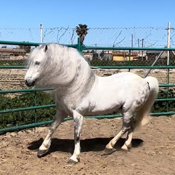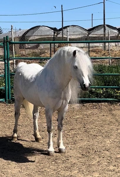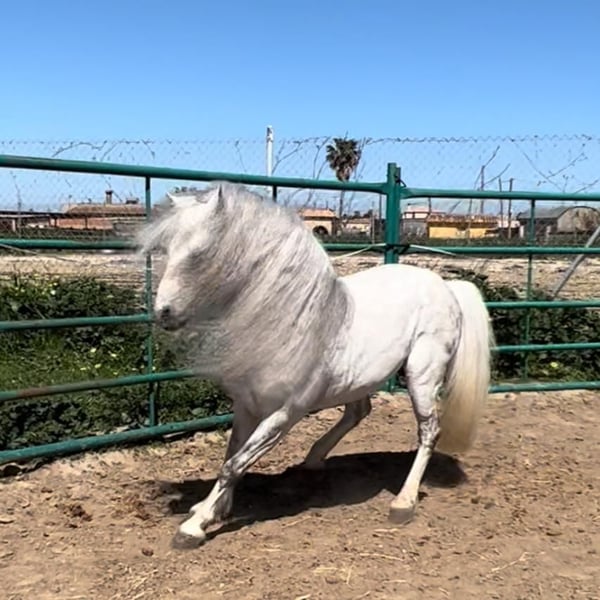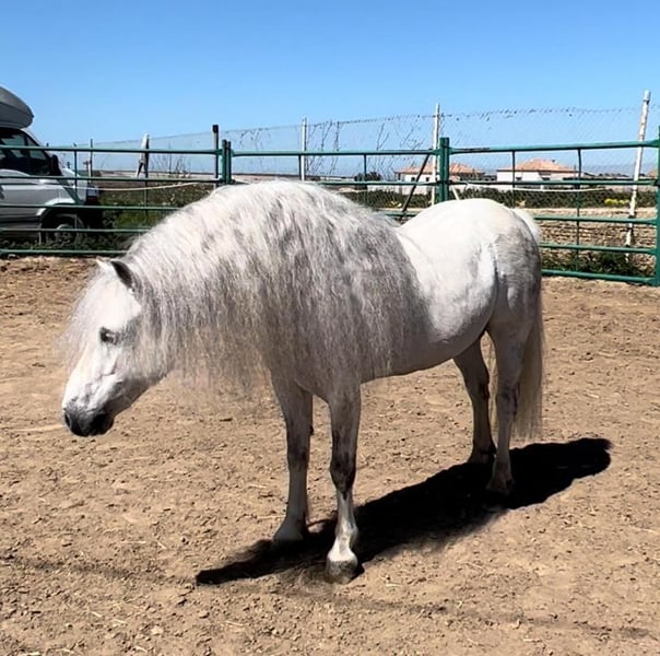 Ce petit bijou fascine tous ceux qui le voient. Il est d'une beauté indescriptible et aime tirer la calèche. Étant utilisé comme étalon, il sait qu'il est un mâle. Mais comme il a un caractère très doux, une castration en ferait sûrement un poney de rêve équilibré. Il n'a pas été monté, mais il connaît quelques figures de spectacle, comme la levade. Un petit défaut esthétique : son magnifique collier de crinière est légèrement de travers. Qui recherche un tel petit superstar ?