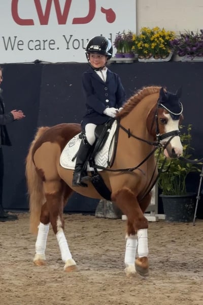 Dream Pony – The perfect companion for dressage, jumping, play, and fun! For sale is a beautiful Welsh-A gelding born in 2014. This charming chestnut impresses with his friendly nature and versatile talents. With a height of 120 cm, he is ideal for small children taking their first steps in riding. His strong talent in the dressage arena makes him a reliable partner for ambitious beginners and more advanced riders. The gelding is well-trained, easy-going, and always shows enthusiasm for work. Play and fun are just as important to him; he can perform some tricks, is comfortable in the outdoor environment including water crossings, and is open to any kind of mischief. From leadline competitions to higher classes, he is a real eye-catcher. Videos and further information are available upon phone inquiry. Of course, we wish for Leo to receive optimal care. If you are interested or have further questions, please feel free to contact me. A personal meeting is always possible!