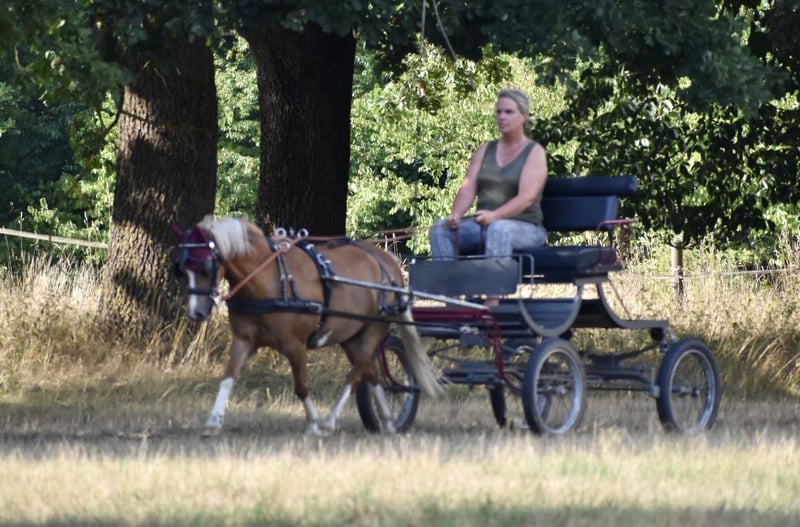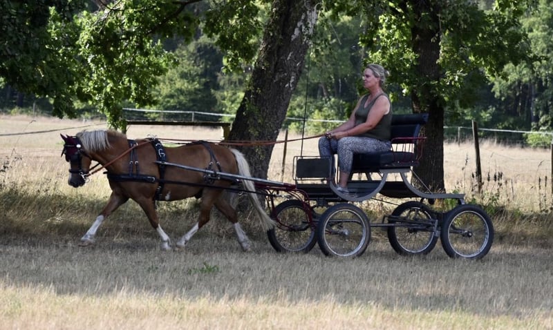 If everything fits perfectly, I would part with my reliable driving pony. He is an absolute guarantee in the field; even with tractors, sudden cyclists, dogs, etc., he remains cool. Unfortunately, we hardly have any space to drive here, so I haven't harnessed him for almost 2 years. Even after a long break from driving, he is completely unproblematic, just not particularly fit. Goldi is NOT a children's pony; he hates children on his back and will immediately throw them off. He is also disrespectful towards children when being led, but always great with adults. He is friendly and playful with other ponies, running in a mixed pony herd with some grazing and sufficient haylage. In winter, he is familiar with a paddock box; a loose housing would also be good, as he has mild asthma and should therefore be kept dust-free. He does not kick or bite, stands patiently while being groomed, and is simply a treasure. No laminitis, no eczema! A trial drive is currently difficult. The price includes harness and marathon cart.
