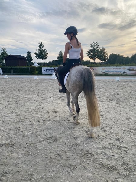 Scally is a 10-year-old stunning Welsh B mare with exceptional charm and a nearly foal-like appearance. She impresses not only with her elegant looks but also with her balanced character, excellent health, and versatility. In competition, she is trained to A-level in dressage and has been successfully shown up to 80 cm in jumping (RA 5). Her powerful and expansive basic gaits—especially in the trot—make her a real eye-catcher in any riding arena. She is ideal for advanced children and teenagers with a balanced seat who are looking for a sensitive, finely rideable pony with go and heart. Scally is always motivated, responsive to aids, and pleasant in the contact. Due to her interesting pedigree, she is also valuable for breeding and would be an asset to Welsh breeding. An all-around great pony for competition (eventing), leisure, and possibly also for breeding, with a lot of potential and a heart of gold. She is only to be sold to nurturing, loving hands.