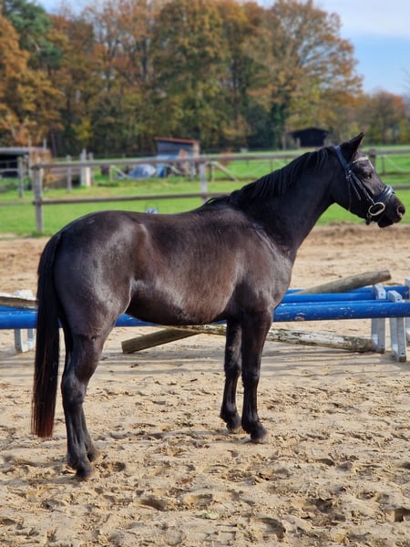 Doutzen, bei uns auf dem Hof genannt Doortje, ist eine hübsche schwarze Stute. Im Umgang ist sie äußerst brav. Das Füße geben, das Stehenbleiben, das ordentliche Mitlaufen an der Leine, das Putzen und Scheren sind kein Problem. Sie ist ein Pony, das das Arbeiten liebt. Sie zeigt gerne eine Show und ist stets motiviert. Mittlerweile kennt sie Longieren an der Longe sowie an den Doppel-Longen. Auch hat sie schon einen Singel-Reithalstrense und das Reithalfter getragen – alles kein Problem. Wöchentlich geht sie als Handpferd mit auf Ausritte. Entlang der Straße und durch den Wald. Dabei ist sie immer super brav und arbeitswillig. Sie lässt sich nicht leicht von Verkehr oder anderen Dingen, die man bei einem Ausritt begegnen kann, beeindrucken. Ich denke, dass Doortje am besten als Kinderpony oder als Reitpony geeignet ist. Sie liebt das Arbeiten sehr und verfügt über drei gute Gänge. In nächster Zeit werden wir sie weiterhin ruhig anreiten, und der Preis wird mit fortschreitendem Training steigen. Das einzige kleine Manko an Doortje ist, dass sie bei einer zuckerreichen Ernährung Juckreiz bekommt. Sie erhält nur Heu, etwas Kraftfutter ohne Getreide oder Luzerne. So hat sie keine Probleme mit Juckreiz.