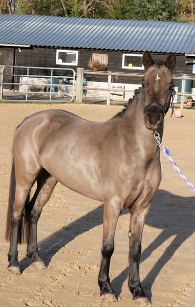 Knappe zwarte merrie van ongeveer 1,25 m groot. Geboren in 2022 Lieve pony in de omgang en is altijd veel in de handen geweest. Ik heb haar gekocht als veulentje als gezelschap voor mijn paard. Maar ik vind het jammer om zo'n leuke en werkwillige pony te laten slijten als grasmaaier. Want ze vindt aandacht echt heerlijk! Ze kent inmiddels longeren aan enkele lijn en aan de dubbele lange lijnen. Ook heeft ze een singeltje op gehad en het hoofdstel, dit was allemaal geen probleem. Inmiddels is ze ook goed bekend met het zadel. Helaas nog niet verder beleerd ivm gebrek van een ruitertje. Wekelijks loopt ze een rondje naast de fiets of gaat ze mee op buitenrit als handpony. Hierbij is ze erg stoer, ook tijdens het stukje dat we langs de weg moeten. Ik denk dat deze pony erg blij gaat worden van een leven als menpony of als sportpony voor een fanatiek ruitertje of amazone. De pony kan heerlijk sjouwen en toont los een goede sprong. Het enige minpuntje aan haar is dat ze jeuk krijgt van een suikerrijk dieet. Met een suikerarm dieet heeft ze hier geen last van. Video: https:www.facebook.com/share/r/18DUwmCdPt/