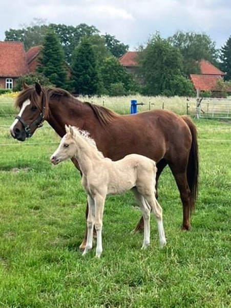 Limetto is an exceptionally typy colt with outstanding Welsh B conformation, correctly built and with convincing movements. In a palomino color with a blaze and four white legs, he is truly a dream. He presents himself as very polite, people-oriented, and open to new experiences. From a breeding perspective, this fine gentleman is something very special, as he brings together the best Welsh B blood: - The dam comes from the legendary show jumper Stars Spirit, who was awarded the Overseas Medal for his quality and scores at the HLP, and has numerous licensed sons and premium mares, including in the riding pony sector. "Spirit Ponies" can be found all over Germany, impressing across the board. - Breeton Dai is one of the most significant stallions in the UK, Germany, and the Netherlands, influencing the breeding of internationally successful Welsh B ponies. - The sire Woldbergs Leonardi produces highly successful riding and driving horses, also in the riding pony breeding. He is a federal reserve champion and FN federal premium stallion, Weser-Ems champion stallion, and HLP reserve champion, showcasing the best Boston Bonaparte blood. To date, four sons have been licensed in Germany. Abroad, there are 16 sons, including the Wales Borders Champion Cadlanvalley Royal Keeper, who is actively breeding. As this stallion is so impressive, we already have several Leonardi offspring that are known as brave and level-headed children's ponies and are in harness. Limetto is growing up alongside his half-brother, frolicking and playing in the open stable and on the pasture. The experienced broodmares provide the necessary socialization. He is regularly dewormed and provided with the best foal feed. He knows the foal ABC, walks well on a halter, and is familiar with giving hooves and being tied. In our daily operations, he learns everything a future children's and driving pony should know. He received the foal premium with excellent judges' remarks and scored 3x 9.0 for type, 3x 9.0 for conformation, and 3x 8.0 for movement at the foal championship. A pony with all doors open, eager to explore the world with a family! He could move to a new home starting in October. We are looking for (Welsh) pony-experienced individuals or breeders who are knowledgeable about the upbringing and training of young horses or who will be supported in this task by experienced individuals. We would be happy to discuss everything further by phone and on-site and look forward to your inquiry! We do not offer a raising facility on-site.