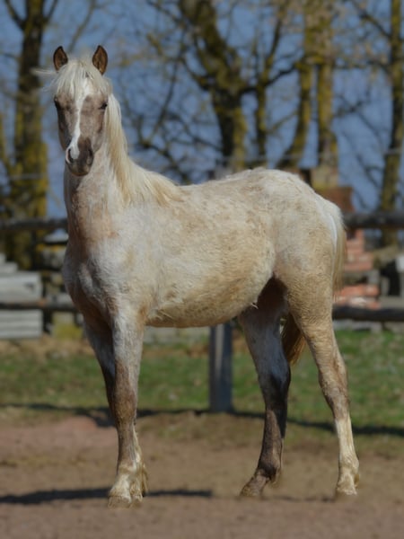 Kienbergs Chester C est un poulain Welsh B très typé, de la couleur de rêve Palomino Roan. En raison d’acheteurs peu fiables, cette perle pleine de caractère cherche malheureusement une nouvelle famille. Ses deux parents sont montés, de grande taille (la mère environ 1,35 m, le père, étalon inscrit, mesurant plus de 1,40 m) et issus de notre élevage. Chester a été élevé selon son âge et est actuellement en compagnie d’un poulain bai, Cadlanvalley Deluxe x Breeton Toy, qui recherche également un nouveau foyer. Les deux jeunes ont été primés à leur foalhood, ils sont vraiment magnifiques et attendent avec impatience la visite de leurs amis poneys.
