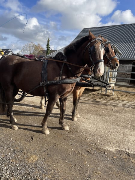 Notre poney bai rouan, Filou (taille environ 1,30 m, né en 2015), cherche une nouvelle famille, car nos enfants ont grandi. Filou est un poney fiable, gentil et très apprécié des enfants, qui a été monté aussi bien qu’attelé en simple et en paire. Nous le possédons depuis qu’il a trois ans. Il a été formé par nos soins ainsi que par la famille. Il connaît les concours, la circulation routière, est calme et facile à gérer. Actuellement, Filou travaille dans une école d’équitation, où il montre chaque jour sa patience et sa fiabilité avec les enfants – que ce soit à la longe, en cours ou lors de petites balades. Il évolue dans un groupe de poneys mixte. Nous souhaitons offrir à Filou un foyer aimant pour la vie, idéalement chez quelqu’un qui aime faire du driving avec lui et lui proposer une activité variée. Filou peut être vendu seul ou en paire. Prix par poney. N’hésitez pas à nous contacter si vous êtes intéressé !