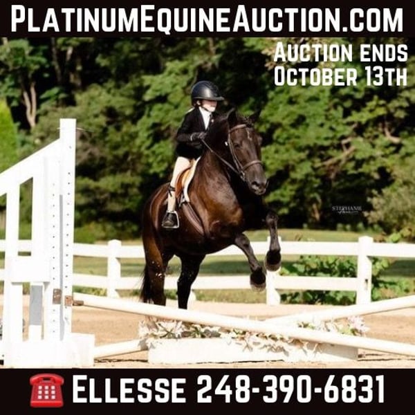 ONLINE AUCTION Place your bids at www.PlatinumEquineAuction.com Starting Bid $3500 Auction ends October 13th, 2024 Need a new saddle? Check out White Rock Saddles on our website or Facebook! Meet Rio! He is a 6 year old, 14.1hh jet black, Welsh Cobb gelding. Rio is put together beautifully with strong bones, solid hooves a baby doll face and big doe eyes. He has been shown in the hunter ring by a teeny tiny 7 year old. He is as honest as the day is long. And to the jumps, absolutely no pony antics. Rio has a fantastic canter and if you can find the corner he will even swap his leads! He has been shown in everything from cross poles to 2ft 6. He has the steep for the big pony stuff but will gladly add for the Littles. Rio has also attended several hunter paces and is fantastic in open fields. Woods, water and wildlife- all no problem for this boy! He’s a fun and trustworthy ride for the bigger kids and adults. Give Rio a bath, pop him on the trailer, and take him to any show venue. He will be the same pony day in and day out. Rio is also broke to drive. His ground manners are A+. He is a joy to have in the barn and gets along with all of the others. Please enjoy the video and give Ellesse Schwartz a call or text at 248-390-6831 if you have any other questions. Rio lives in Howell, MI. ONLINE AUCTION Place your bids at www.PlatinumEquineAuction.com Starting Bid $3500 Auction ends October 13th, 2024 Need a new saddle? Check out White Rock Saddles on our website or Facebook!