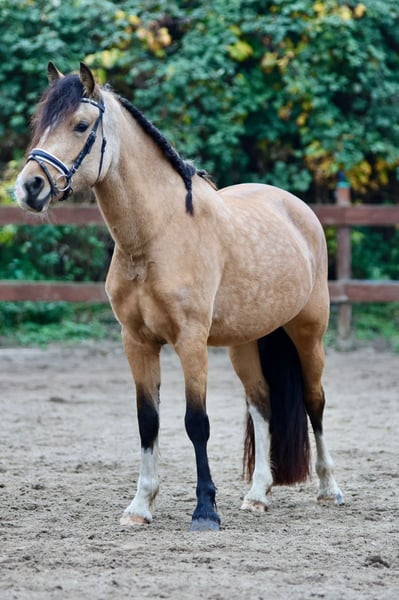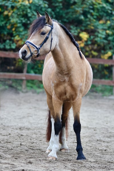 Im Auftrag sucht diese wunderschöne Falb-Stute ein neues Zuhause. Bailey überzeugt trotz ihres Alters bereits mit unwahrscheinlicher Unerschrockenheit und Ruhe. Sie ist altersgemäß geritten, kennt dementsprechend auch alle Grundgangarten unter dem Sattel und lässt sich hierbei auch bereits von 10j. Mädchen in der Abteilung reiten. Bailey kennt keine Unarten wie Steigen, Bocken , durchgehen oder ähnliches. Für Bailey stehen alle Türen offen. Wir können sie uns gut als Kinderpony vorstellen, aber auch als Freizeitpferd oder für sportliche Ambitionen. Ein Pony mit dem Herz am Rechten Fleck. Ein Video kann unter 015228865369 versendet werden.
