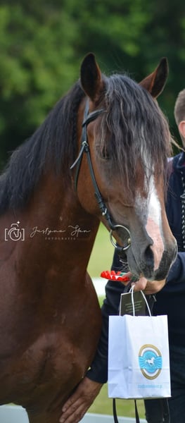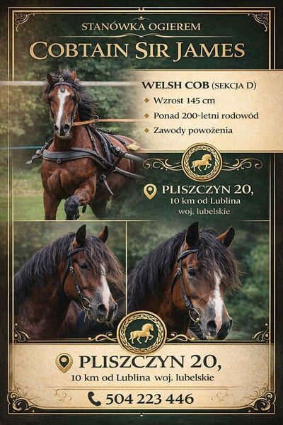 Cobtain Sir James Rasa: Welsh Cob (Sekcja D) Wzrost: 145 cm Oferujemy stanówkę sprawdzonym ogierem hodowlanym Cobtain Sir James, wywodzącym się z linii hodowlanej o ponad 200-letniej historii. Rodowód typowy dla rasy Welsh Cob – nastawiony na użytkowość, wytrzymałość, poprawny ruch oraz stabilny charakter. Charakterystyka hodowlana: • bardzo dobry, zrównoważony temperament („dobra głowa”), • spokojny, chętny do pracy, łatwy w obsłudze, • poprawna budowa i wyraźny typ rasy, • predyspozycje zaprzęgowe. Użytkowość: Ogier aktywnie uczestniczy w zawodach powożenia, co potwierdza jego wartość użytkową, odporność psychiczną oraz zdolności ruchowe. Może przekazywać potomstwu cechy pożądane zarówno w hodowli sportowej, jak i rekreacyjno-użytkowej. Przeznaczenie hodowlane: Polecany do klaczy w celu poprawy: • temperamentu, • użytkowości zaprzęgowej, • ruchu i charakteru potomstwa, • zachowania klasycznego typu Welsh Cob. 📍 Miejsce stanówki: Pliszczyn 20, ok. 10 km od Lublina, woj. lubelskie 📞 Kontakt: 504 223 446