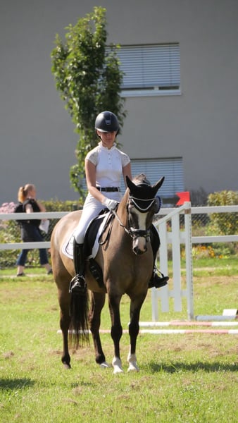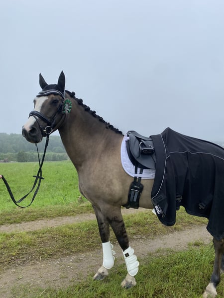 Mit „Daiquiri“ haben wir einen bildschönen 7-jährigen Wallach im Endmaß (1,48 m) anzubieten. Neben seiner attraktiven Aufmachung überzeugt er mit drei guten Grundgangarten und einem absolut liebenswerten Interieur. Im Umgang zeigt er sich stets brav, unkompliziert und verlässlich – ein echtes Herzenspony, das sich durch nichts aus der Ruhe bringen lässt. Auch Kinder können ihn problemlos putzen, führen und verwöhnen. „Daiquiri“ wurde sorgfältig ausgebildet und konnte in Ruhe reifen. Aktuell ist er in der Dressur bis A**ausgebildet und vorgestellt, mehrfach A* platziert. Zusätzlich zeigt er sich im Gelände absolut sicher und gelassen. Er ist ein echtes Schleifenpony, das sich im Viereck stets von seiner besten Seite präsentiert. Durch sein Stockmaß und seinen Rahmen deckt er sowohl Jugendliche als auch Erwachsene problemlos ab. Sein Vater ist der bewährte Vererber Danny Gold, der im Ponysport zahlreiche erfolgreiche Nachkommen hervorgebracht hat. Mit seinem tollen Charakter, seiner vielseitigen Veranlagung und seinem klaren Kopf bietet „Daiquiri“ beste Voraussetzungen für den gehobenen Ponysport ebenso wie für den ambitionierten Freizeitbereich. Selbstverständlich ist er unkompliziert im täglichen Handling – vom Schmied bis zum Verladen. Bei entsprechender Förderung reift hier ein Pony heran, das seinem neuen Reiter viele schöne Erfolge und unvergessliche Momente bescheren wird. Für weitere Bilder und Videos melden Sie sich gerne .