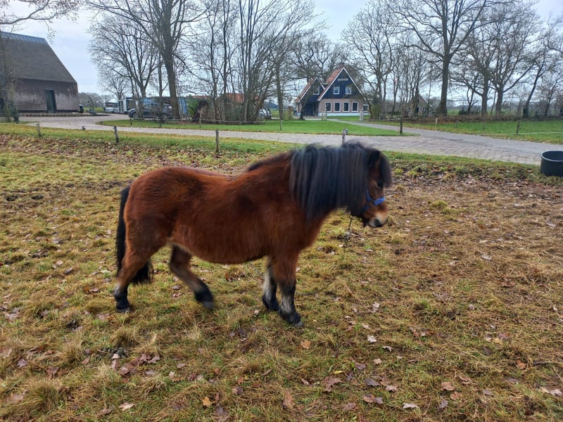 Mooie, lieve Shetlander pony, schofthoogte 100 cm, is een merrie. Loopt braaf mee aan het halster, kent poetsen en borstelen. Staat in de wei met een andere pony. Ze worden regelmatig verzorgd door meiden uit de buurt. Ze is onbeleerd, maar hier zeker geschikt voor.