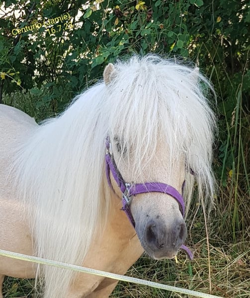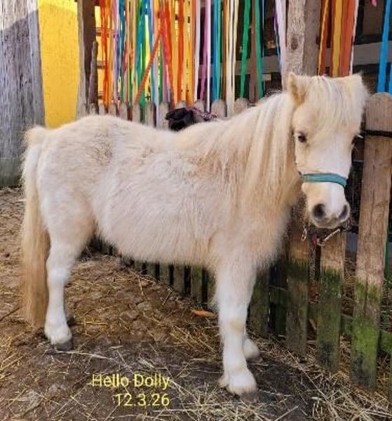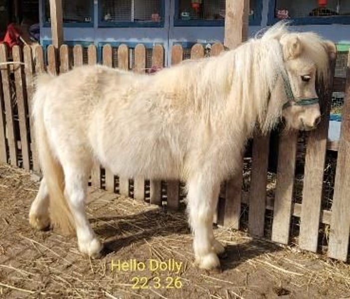 Hello-Dolly unser 3jähriges Shetty-Stute in Palomino-Schecke, sucht jetzt einen guten neuen Lebensplatz. Seine Mutter ist eine wunderschöne Shettlandstute mit 95 cm und der Vater ist ein Mini-Shetty-Hengst mit 81 cm. Dieser ist ebenfalls ein sehr ruhiger, folgsamer, menschbezogener Hengst und gekört. Beide Elterntiere sind bei uns anzusehen. Hello-Dolly ist in der Herde aufgewachsen. Sie ist ein sehr menschenbezogene, sehr liebe Stute ohne igendwelche Macken. Sie gibt brav die Hüfchen, lässt sich führen, sucht den Kontakt zum Menschen und hört auch auf ihren Namen. Er fährt problemlos Hänger, kennt Hunde und Ziegen. Er trägt die tolle Farbe Palomino-Schecke. Er hat einen Equidenpass und ein halbes Papier. Weitere Infos per Tel 0160/90153955