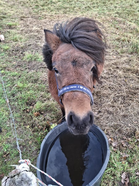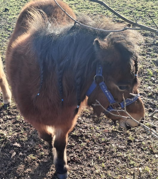 Schönes, liebenswertes Shetland-Pony mit einer Stockmaß von 100 cm, eine Stute. Geht brav am Halfter mit, kennt Putzen und Bürsten. Steht mit einem anderen Pony auf der Weide. Wird regelmäßig von Mädchen aus der Umgebung gepflegt. Ist ungebildet, aber dafür bestens geeignet.