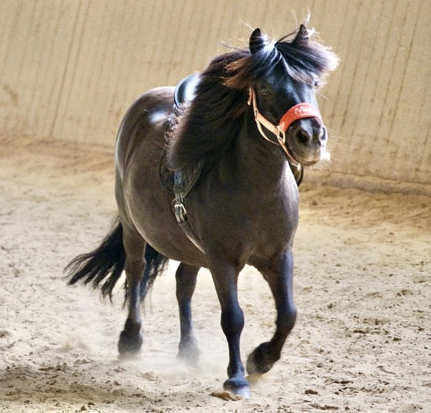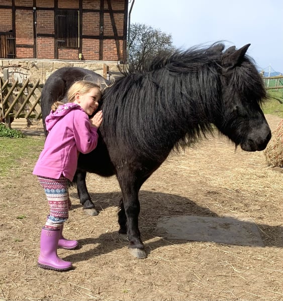 Dieses Pony ist ein äußerst gelassener und unerschrockener Charakter, der auch in neuen Situationen zuverlässig und ruhig bleibt. Vorbeifahrende Traktoren, plötzlich bellende Hunde, umfallende Gegenstände oder herumrennende Kinder lassen ihn komplett kalt. Es stammt aus einer früheren Schulbetriebs-Nutzung und kennt daher viele Kinder, unterschiedliche Reiterfahrungen sowie regelmäßiges Arbeiten an der Longe. Longieren, Reiten und Bodenarbeit gehören zu seinem Alltag und werden sicher und unkompliziert von ihm umgesetzt. Besonders gerne wird es geistig beschäftigt: Clickertraining, kleine Tricks und abwechslungsreiche Aufgaben nimmt es mit Begeisterung an und lernt sehr schnell. Besonders gerne geht er im Wald spazieren. Im Umgang ist es freundlich, aufmerksam und alltagstauglich. Kinder, Hunde, Trubel – all das kennt es gut und bleibt stets entspannt. Die Hufe werden regelmäßig gemacht, die Zähne wurden zuletzt im Herbst 2025 gemacht. Papiere mit Abstammung sind vorhanden, Impfstatus ist regelmäßig aufgefrischt. Umfangreiches Zubehör kann mit gekauft werden: Sattel, Zaumzeug, Equipment fürs Longieren und weitere Ausstattung.
