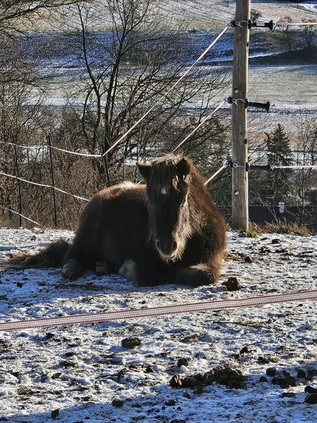 We are offering our nearly 3-year-old gelding into caring, experienced hands. He currently lives in an open stable in a mixed herd with both young and older ponies and horses of various sizes, and is well integrated there. He is very well socialized, enjoys movement, and presents himself as a lively, playful young colt. In the herd, he holds a mid to high rank and loves social contact with his peers – a playmate should definitely be part of his future home as well.